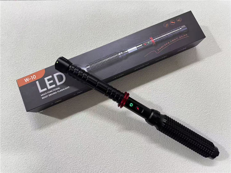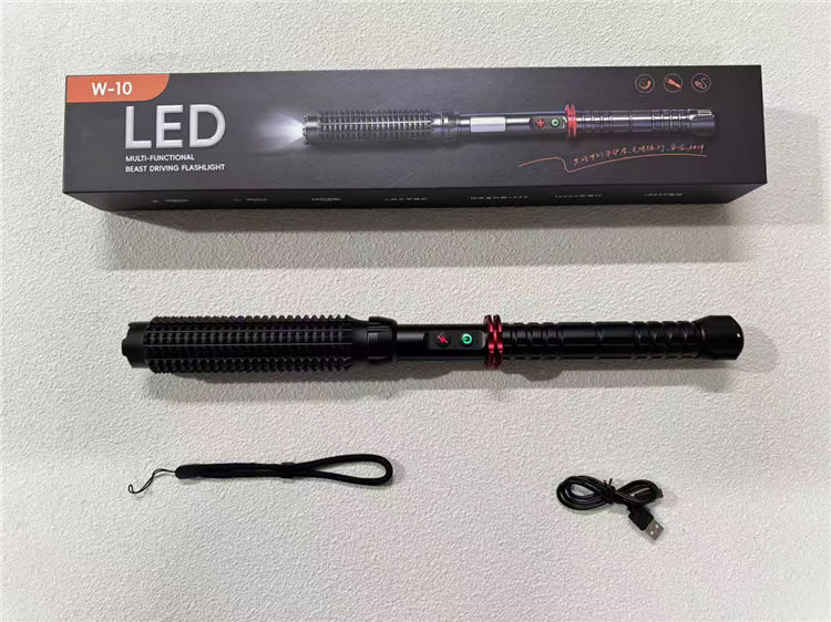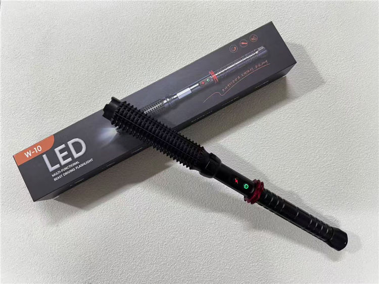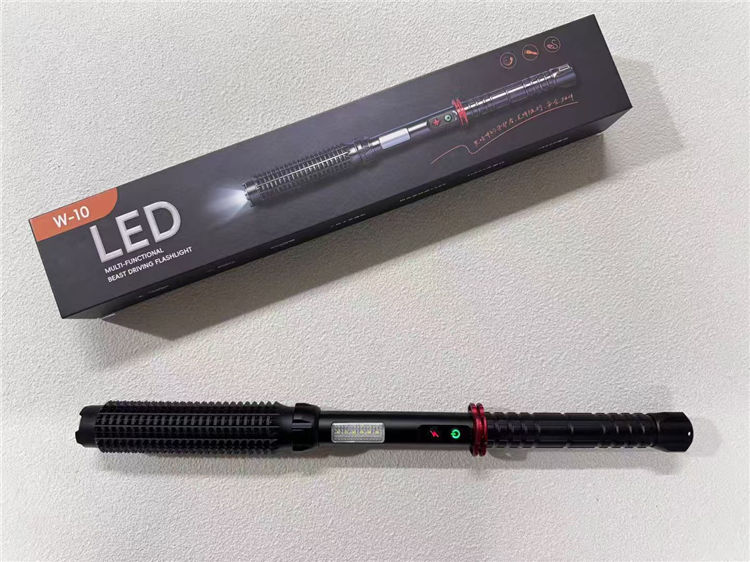 W-10防身手电电棍 前灯强光1500流明,前灯低光800流明 侧灯600流明,航空铝合金,配备两节18650电池 中间红圈陀螺旋转可把玩 保安巡逻首选