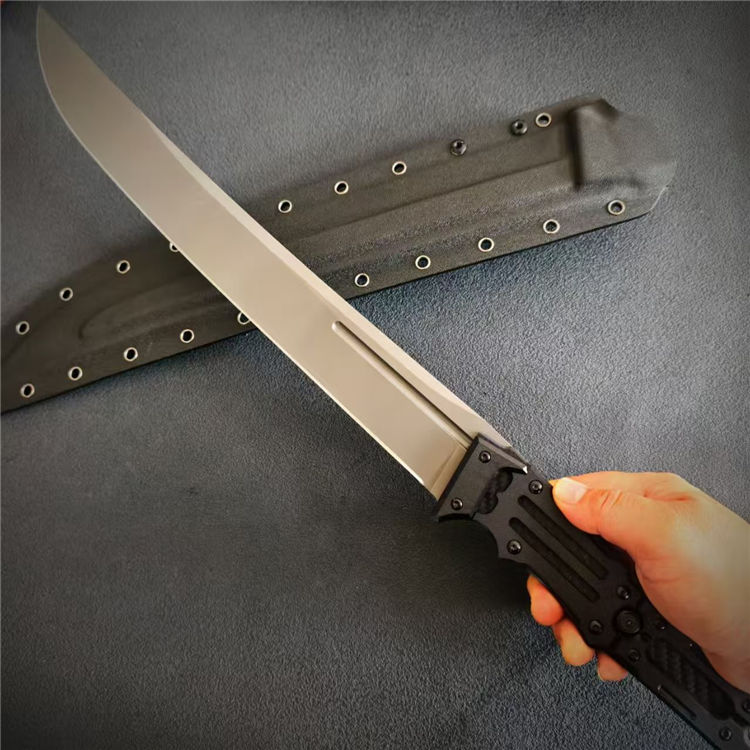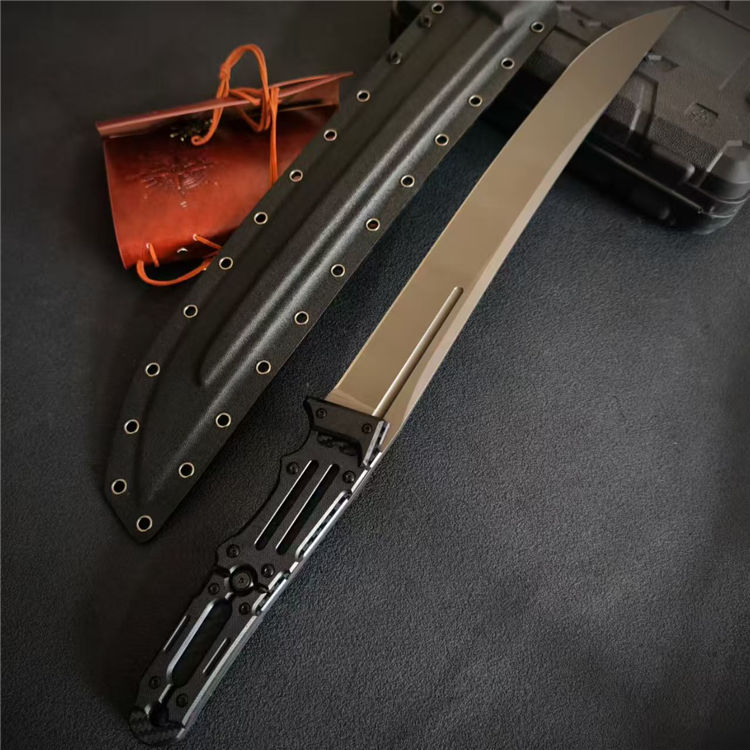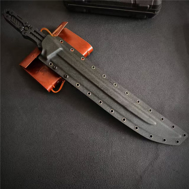 根本朋之雷电之剑二代直刀 全长:58.5cm 刃长:39cm 刃宽:46mm 刃厚:7mm 钢材:CPM-3V 柄材:碳纤维+G10手柄 硬度:61HCR 重量:930g(含鞘1176g) 超高性能,灰色镀钛涂层,一体龙骨,手工镜面刃,战术K鞘