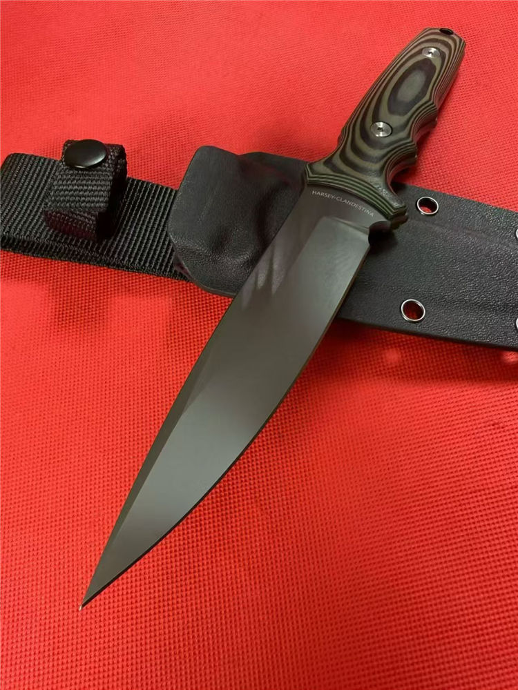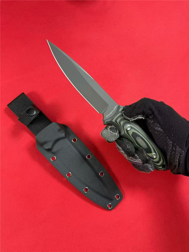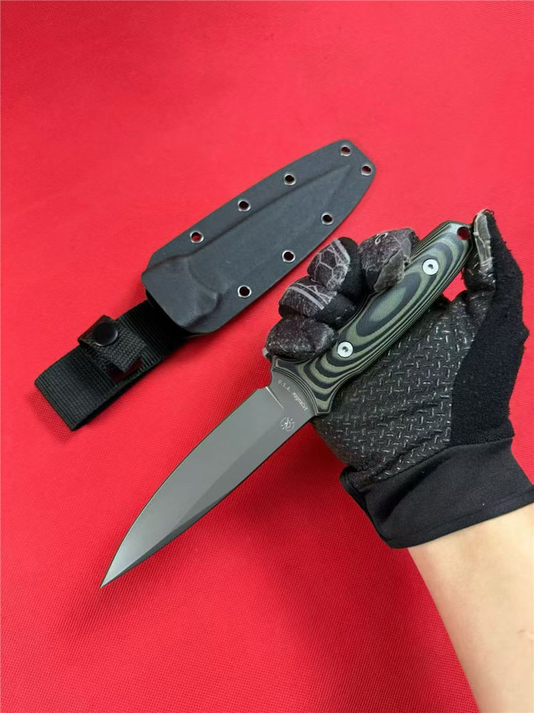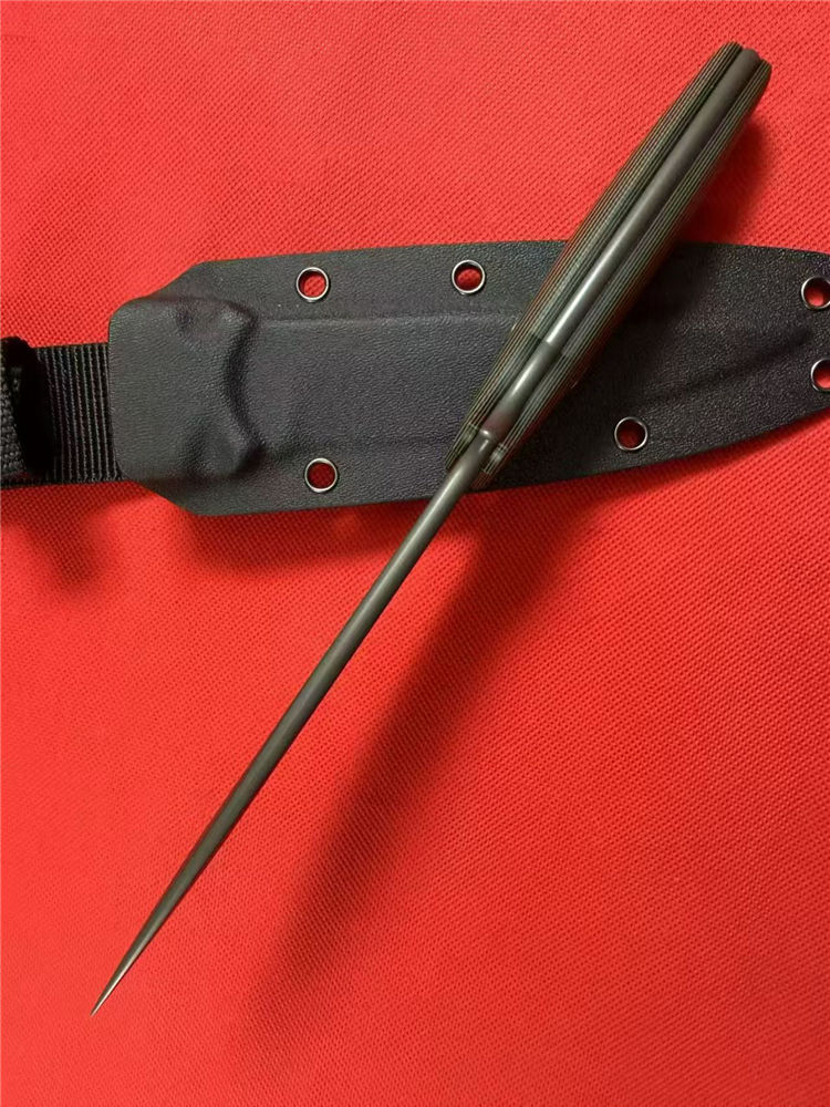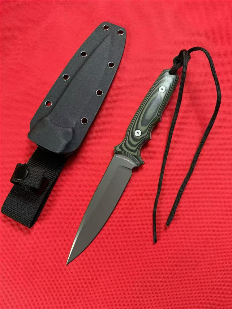 斯巴达秘密之刃直刀 全长:259mm 刃长:127mm开刃部分 柄长:119mm 刃宽:30mm最宽处 刃厚:4.9mm 刃材:8CR14MOV 热处理:真空油淬深冷高温热处理 刀重:245g/320g含鞘 硬度:59-60HRC 表面:镀钛 柄材:黑绿双色G10 结构:一体龙骨成型 刀套:战术K鞘+织带 包装:黑盒子