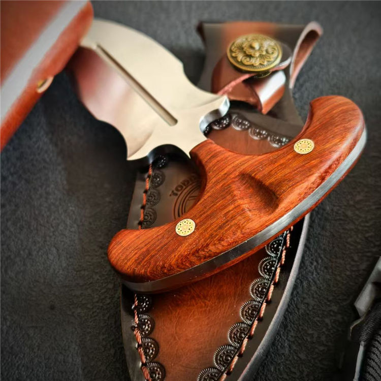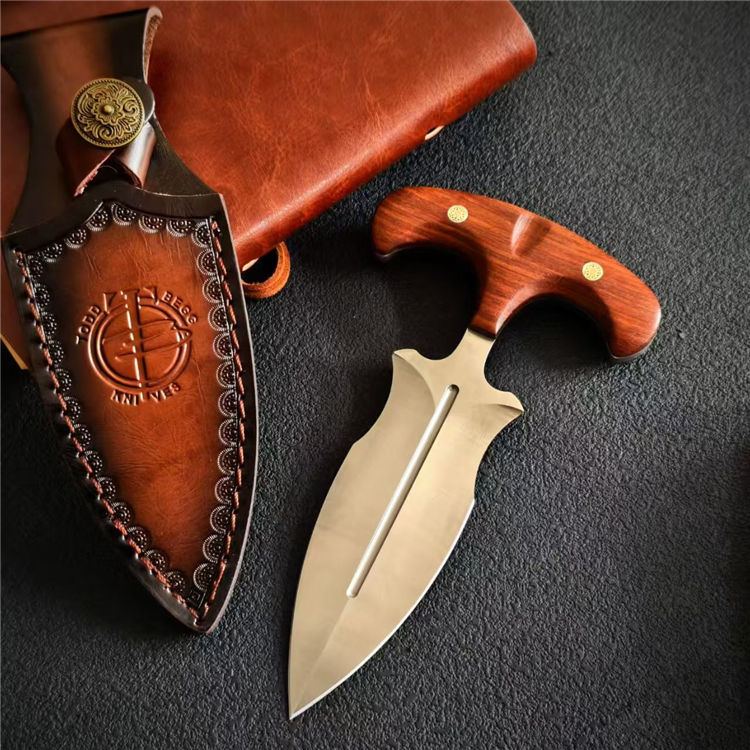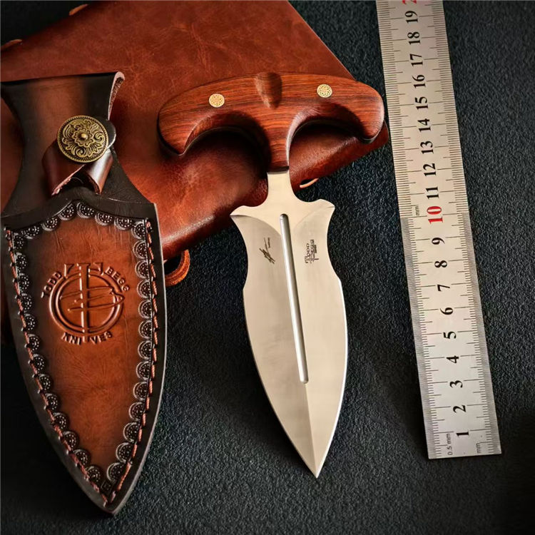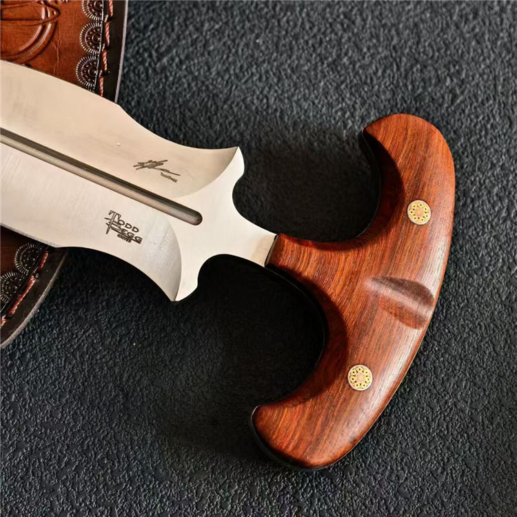 托德·贝格牛头手刺 全长:17cm 刃长:8cm 钢厚:5mm 钢材:D2 柄材:红檀 重量:184g(含皮套230g)