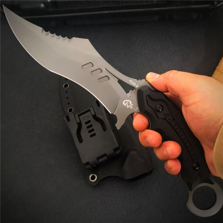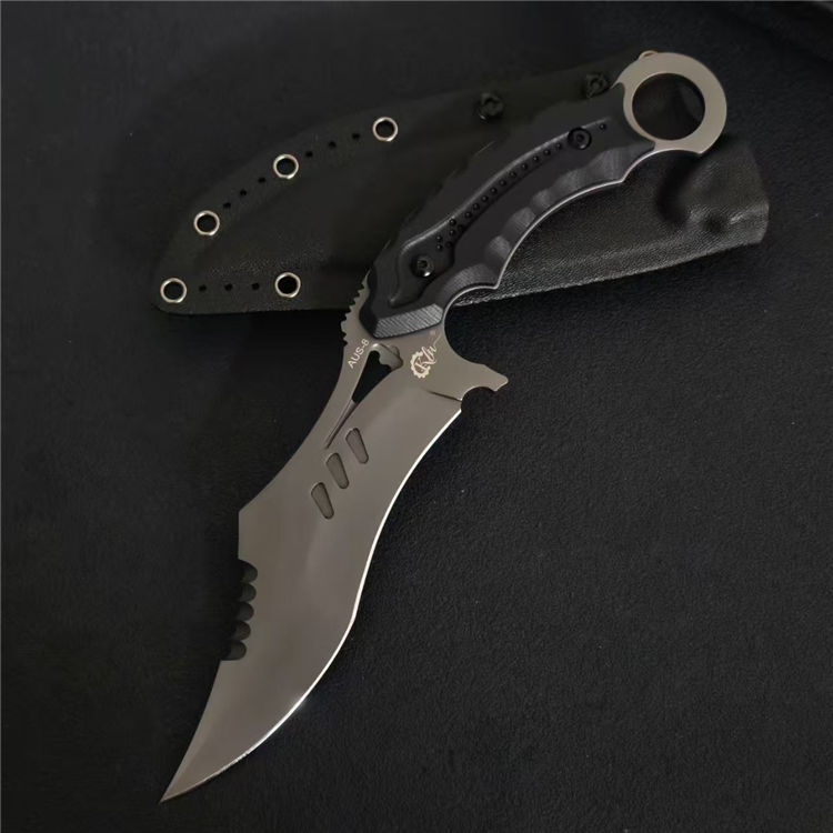 鳄龙爪刀 总长:30.3cm 刃长:15.5cm 刃宽:4.6cm 刃厚:5mm 重量:352G(含鞘462g) 钢材:AUS-8 硬度:60HRC 热处理:真空热处理 柄材:黑色G10复合材质电脑CNC加工 包装:黑色手工盒子包装