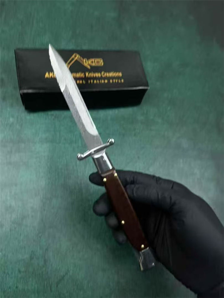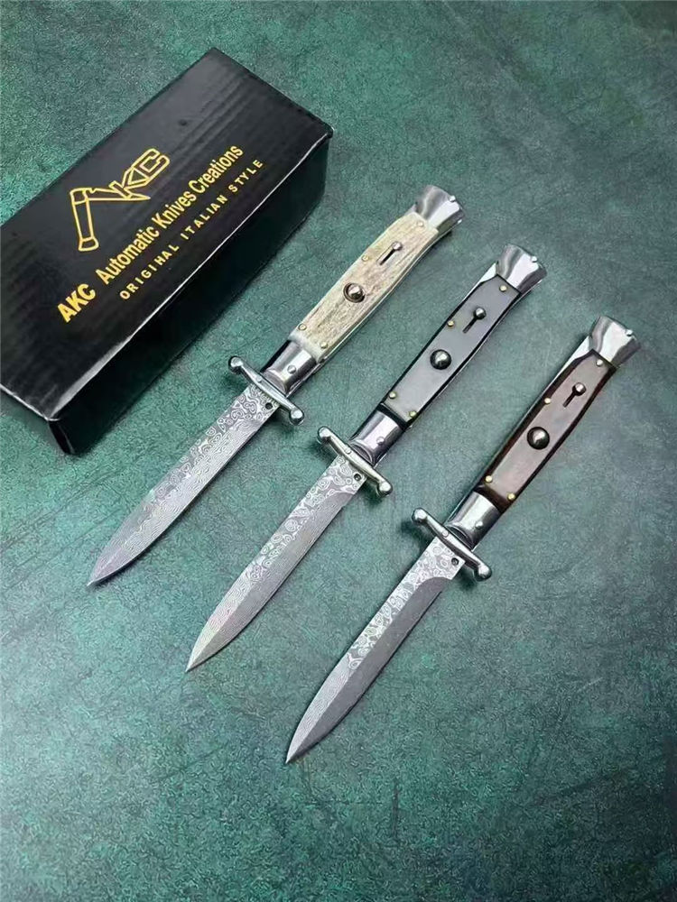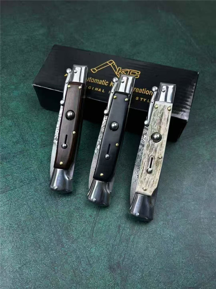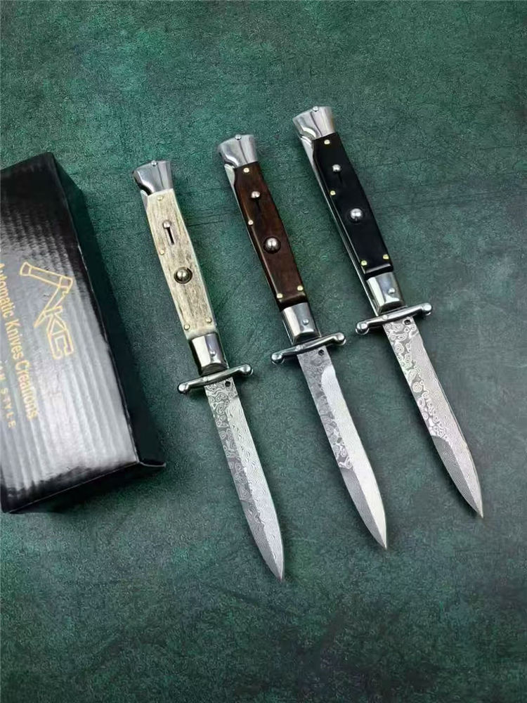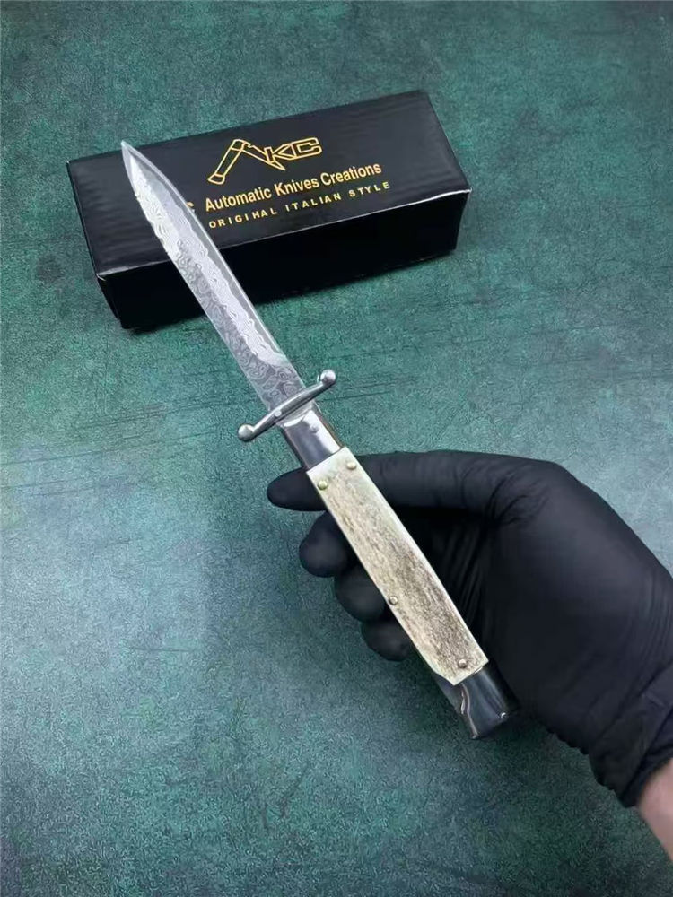 大马士革黑手党守护神侧开跳刀 全长:23cm 刃长:10cm 刃厚:3mm 刃材:大马士革钢 硬度:60 柄材:钢+牛角 重量:30克 包装:礼盒