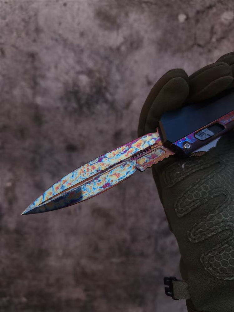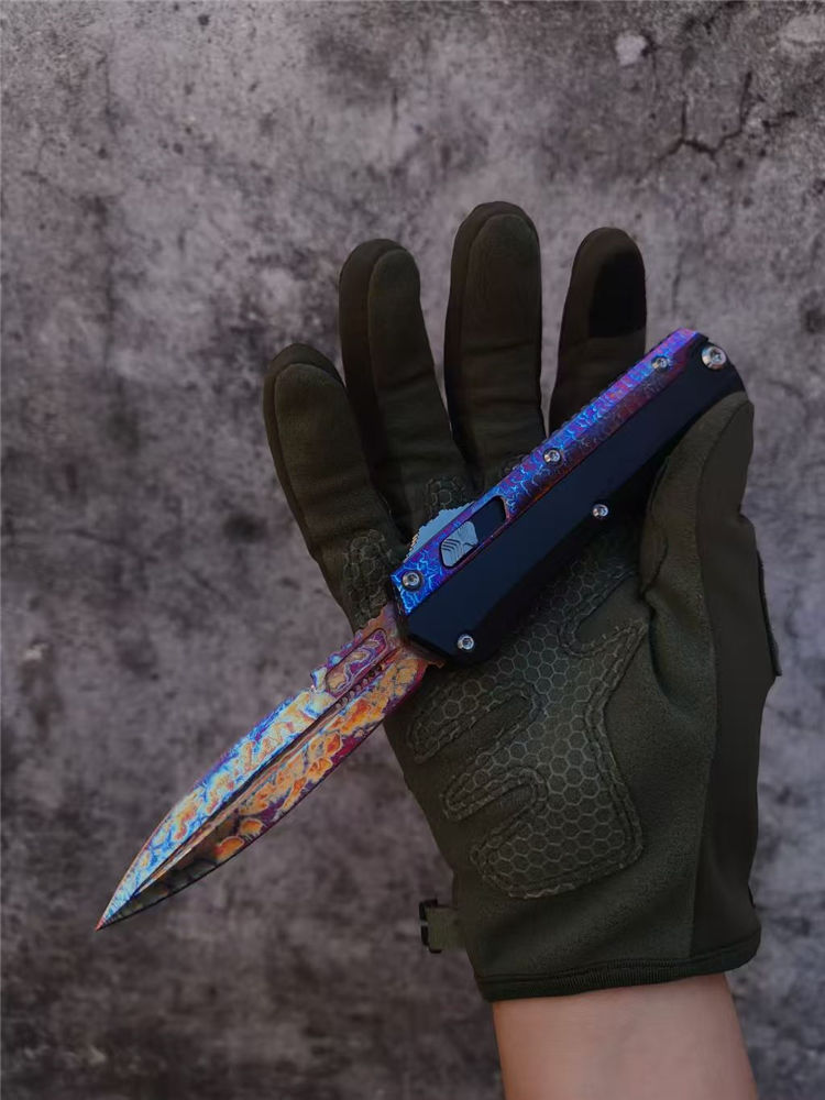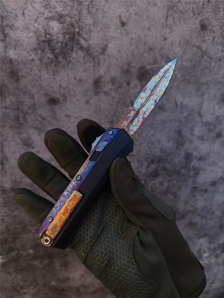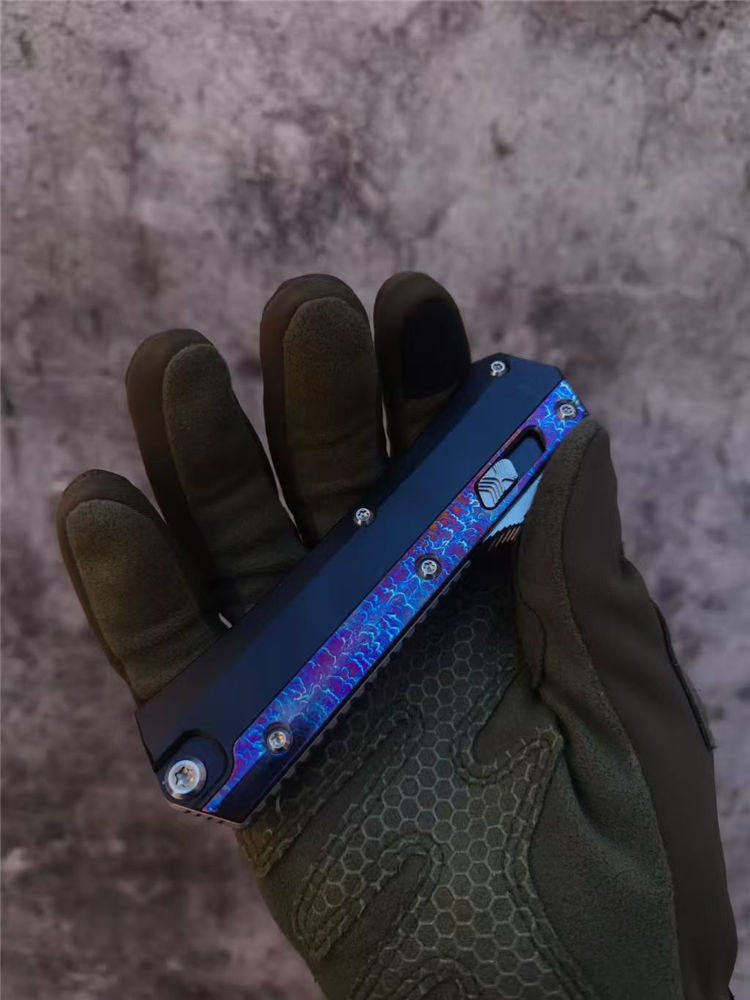 微技术蛇神风暴闪电纹版直出跳刀 全长:22cm 刃长:9.5cm 刃厚:2.95mm 刃宽:20.3mm 柄厚:13.7mm 柄宽:28mm 刃材:m390 柄材:7075铝合金,tc4钛合金贴片 硬度:60HRC 重量:143g