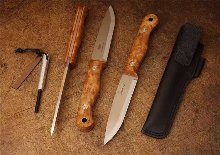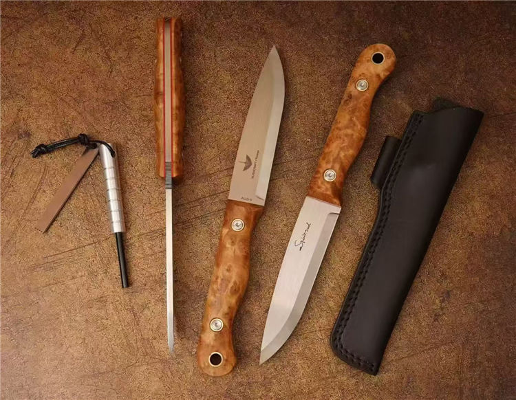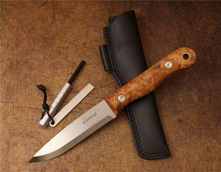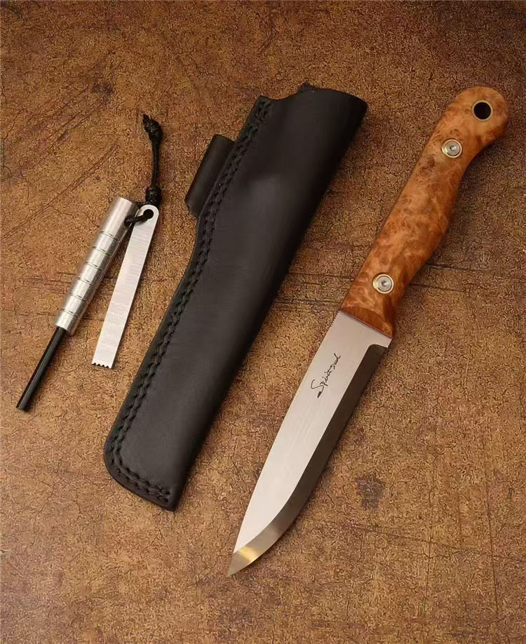 北欧芬兰雷胖子直刀 全长:25cm 刃长:12cm 刃材:进口AUS-8钢 硬度:58-60HRC 表面:手工抛光拉丝 热处理:真空深冷热处理,低温二次回火 柄厚:2.3cm 柄材:稳定雀眼枫木树瘤,内藏红G10复合材质(天然木花纹有深浅与大小) 刃厚:4mm 刃宽:2.8cm 重量:199克 设计者:FANG XIN 类型:北欧芬兰生存刀,佩戴皮质刀鞘+打火石镁棒 包装:手工黑色盒子包装附送皮绳装饰