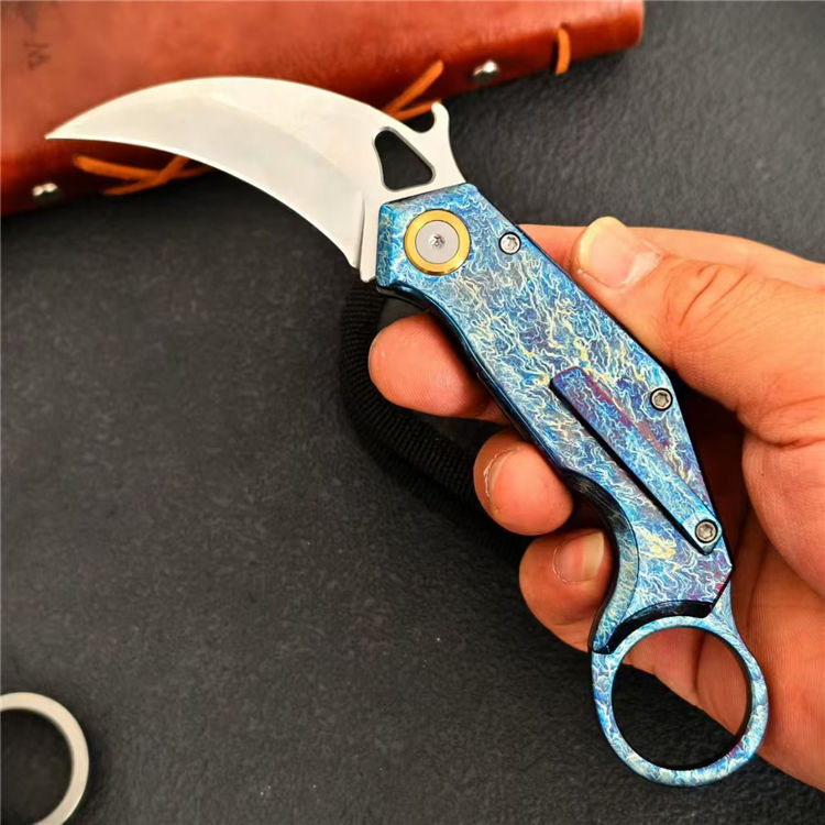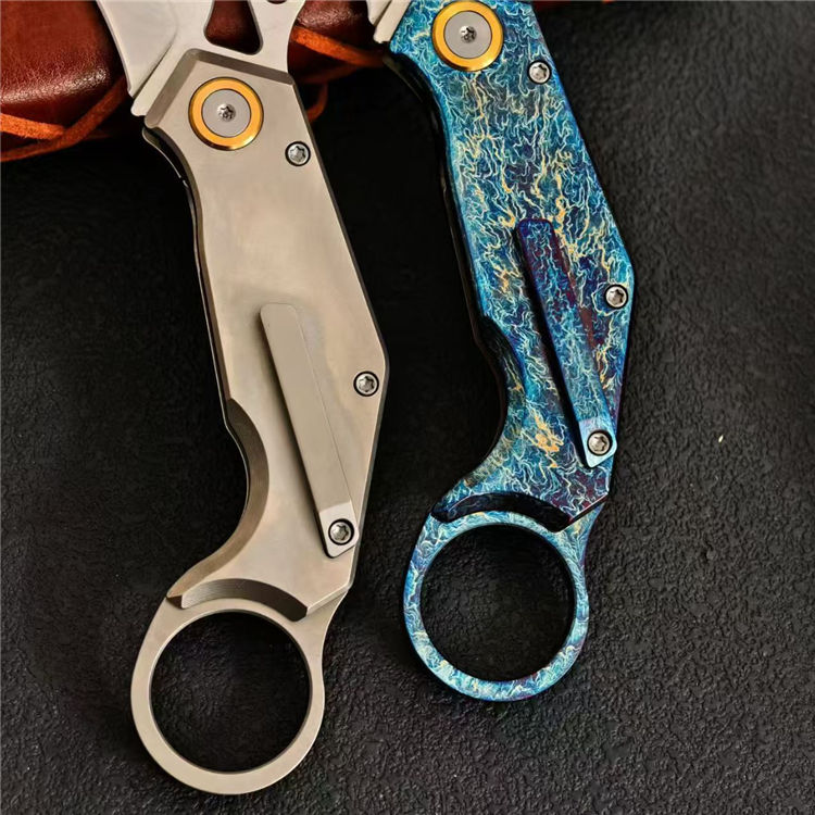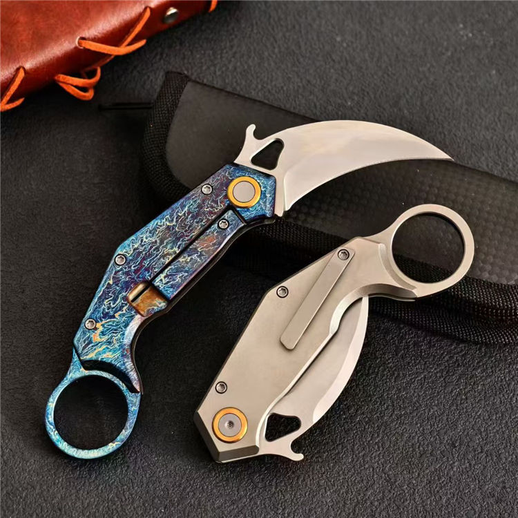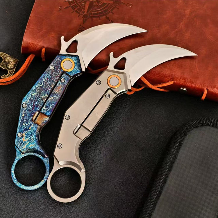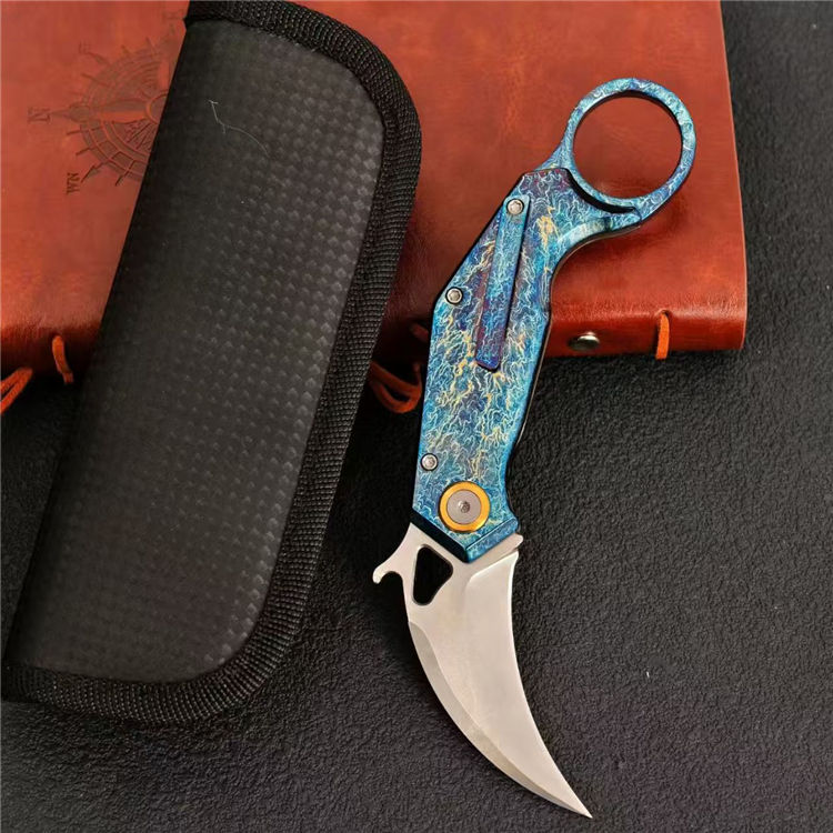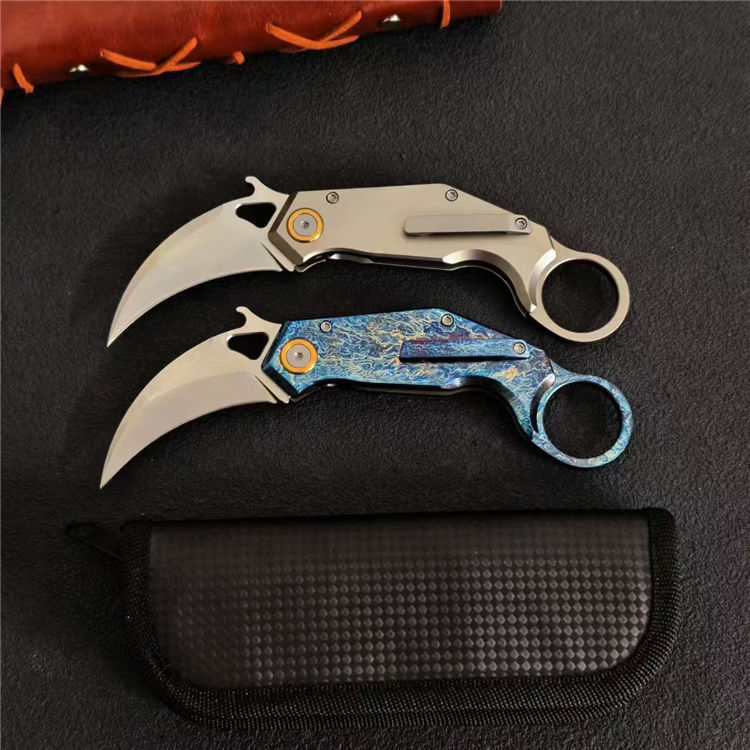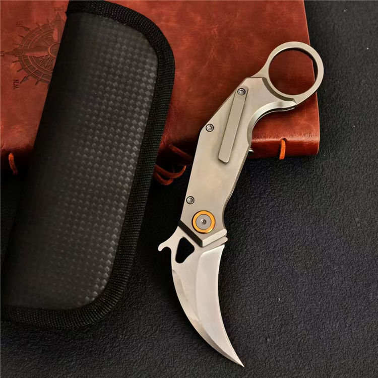 钛合金钛影爪刀 全长:170cm 刃长:6.3cm 柄长:11.7cm 刃宽:2.5cm 刃厚:0.4cm 刃材:14C28N(深冷处理) 净重:123克 总重:167克 硬度:59-60HRC 表面:喷沙 柄材:TC4钛合金 刀夹:TC4钛合金 结构:陶瓷轴承 其他:刀包