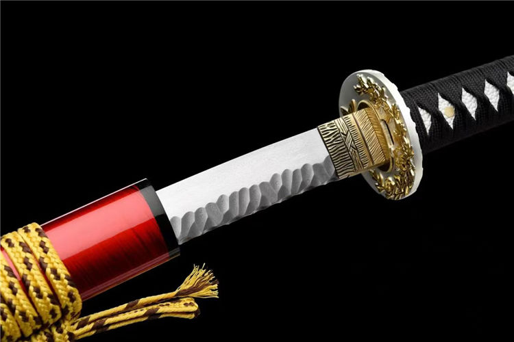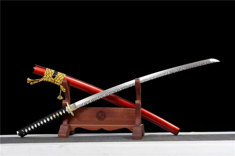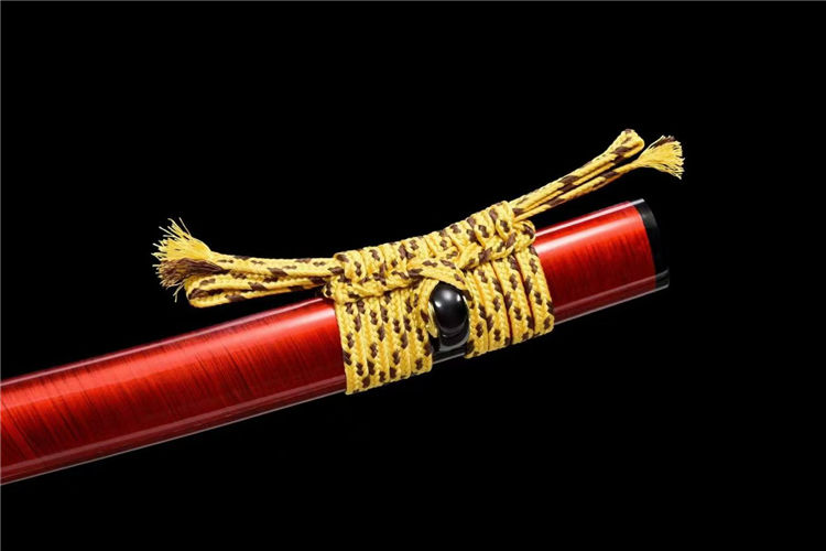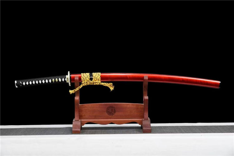 红颜知己武士刀 全长:103cm 刃长:72cm 柄长:26cm 刃厚:0.7cm 刃宽:3.2cm 重量:1.25KG 刃材:百炼花纹钢保留原始煅打石纹,锻打弯曲90度迅速回直高硬度高达60度 锌合金套装 鞘材:实木大漆鞘 手柄:手工绕绳 赠品:高档锦盒