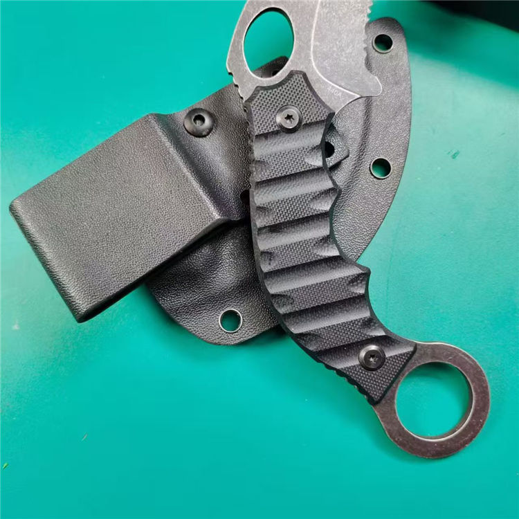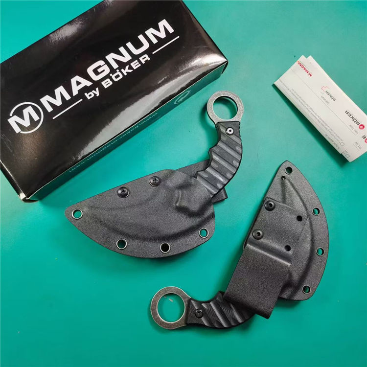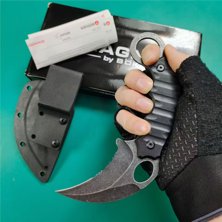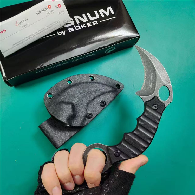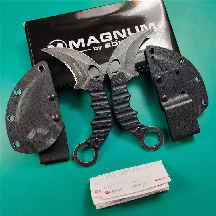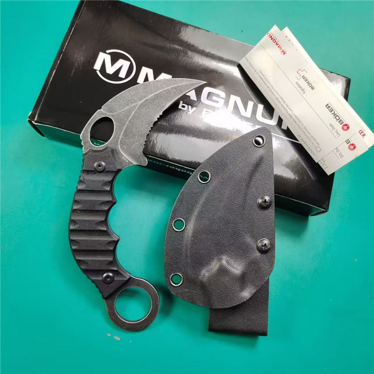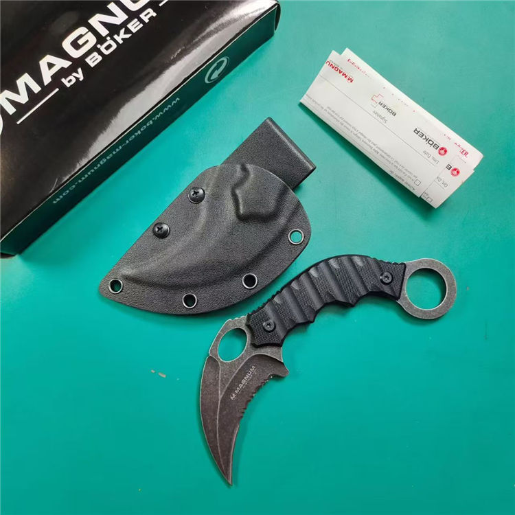 博克战术半齿爪刀 全长:17.5cm 刃长:7cm 柄长:10.5cm 刃厚:3.5mm 刃材:440A钢 刀宽:4cm 硬度:59-60HRC 表面:沧桑石洗 刀套:进口k鞘 重量:约194克(带鞘) 刀柄:G10 其它:黑色原厂盒