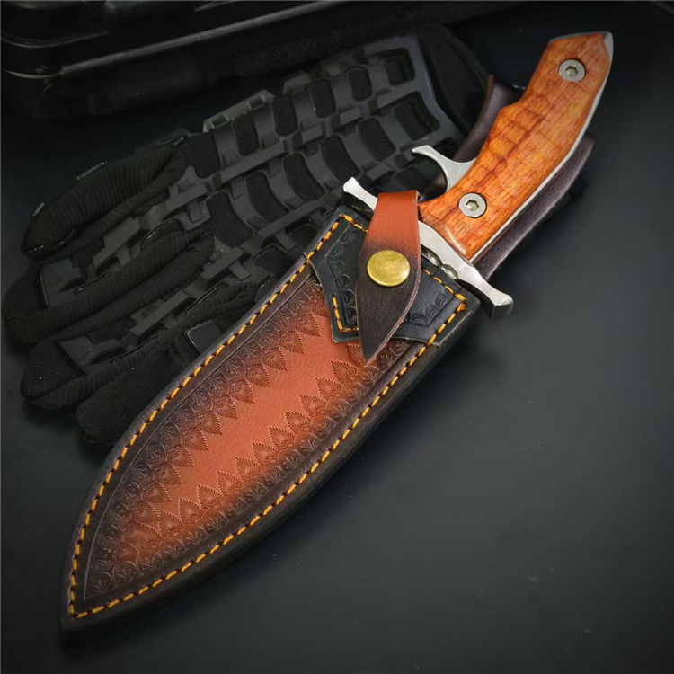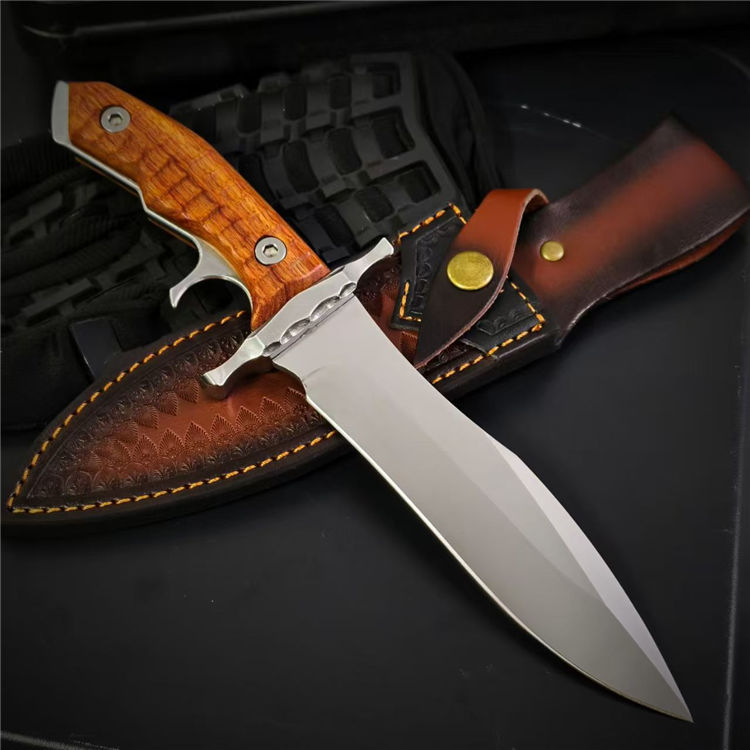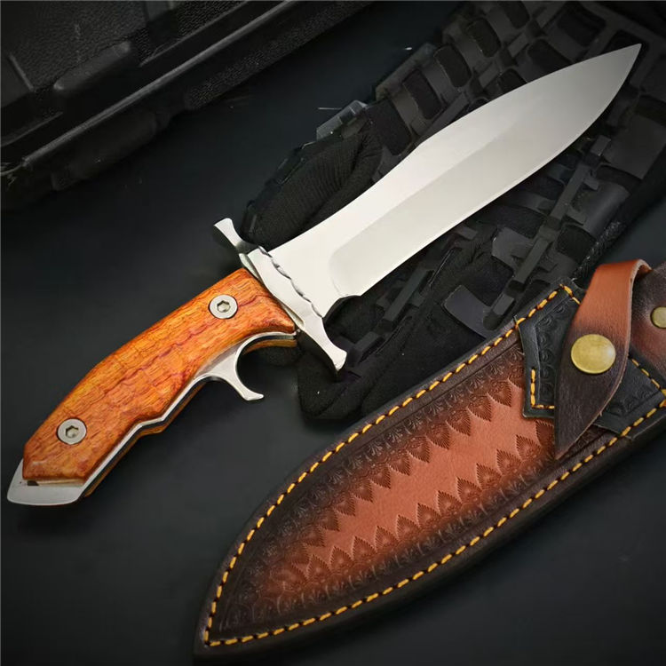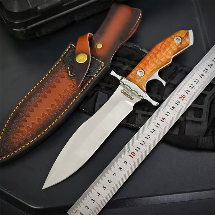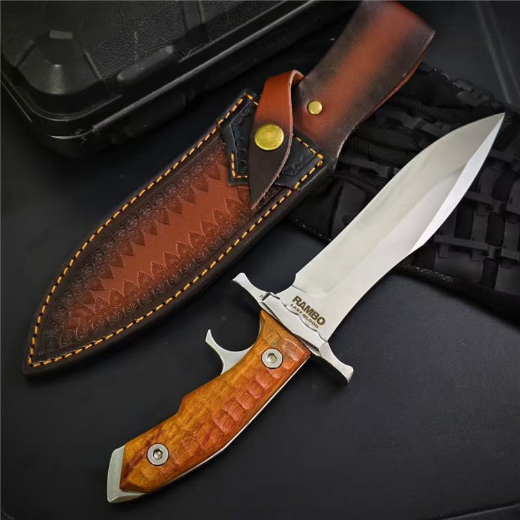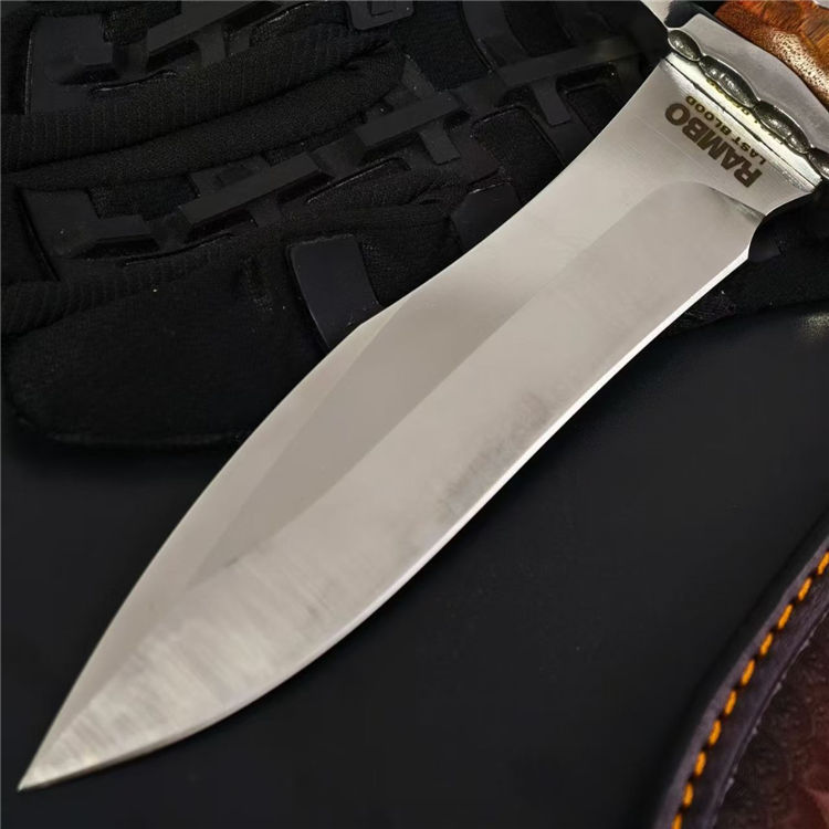 兰博史泰龙博伊直刀 全长:28.5cm 刃长:14.7cm 刃宽:3.6cm 刃厚:5mm 钢材:7CR17MOV 柄材:红贵宝 柄长:11.4cm 重量:339g(含皮套400g)