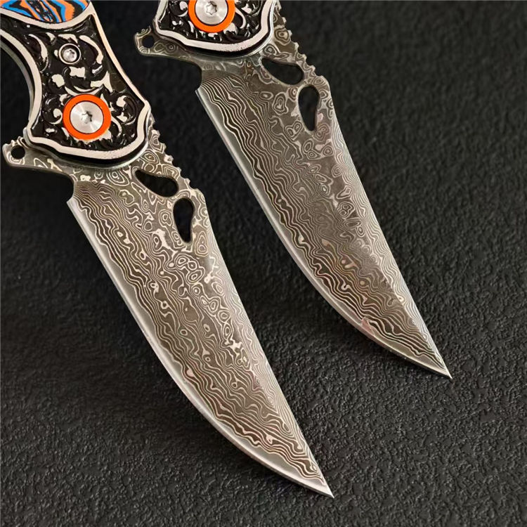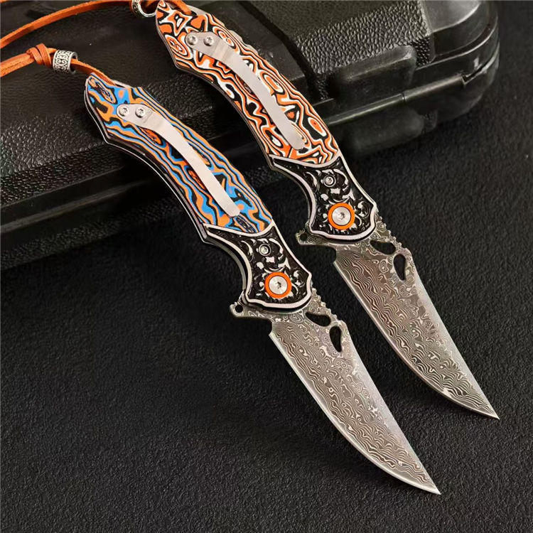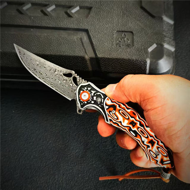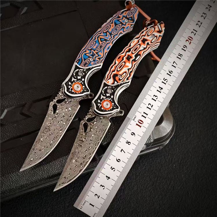 大马士革麒麟折刀 总长:19.8cm 刃长:8.3cm 柄厚:1.5cm 刃厚:0.3cm 柄宽:2.6cm 柄度:11.5cm 刃材:大马士革 颜色:橙白、橙蓝 硬度:59HRC 刃宽:2.4cm 柄材:G10+不锈钢 表面:酸洗工艺 重量:132g