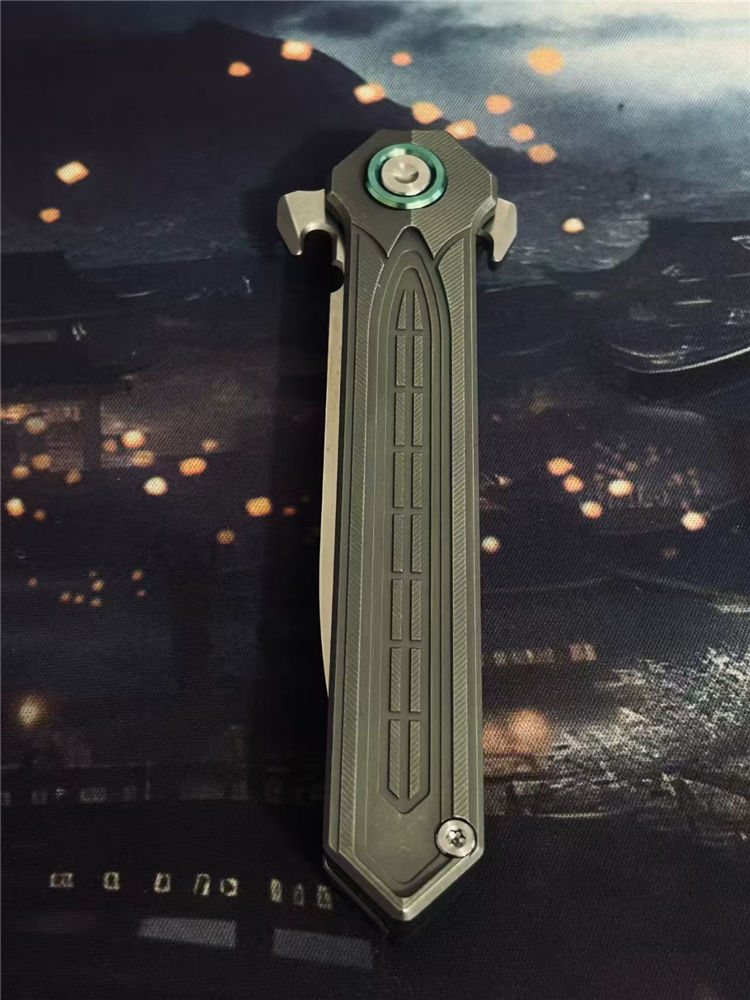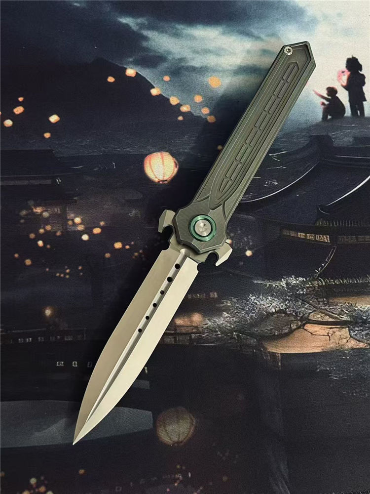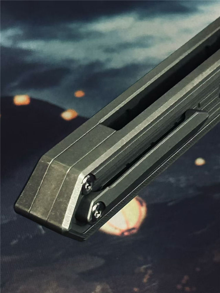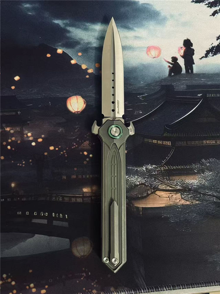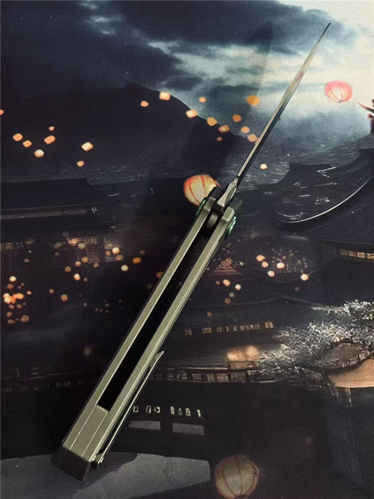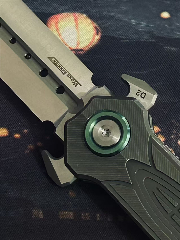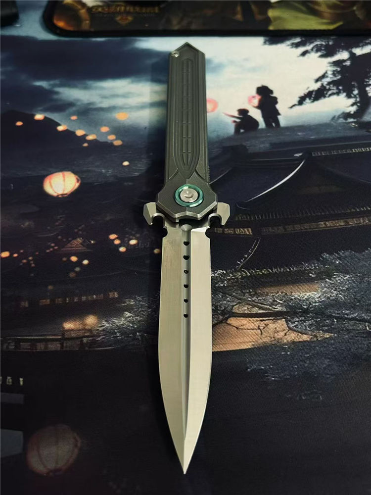 核心撕裂者折刀 全长:22.5cm 刃长:9.5cm 刃宽:2cm 刃厚:4mm 柄长:12.5cm 刃材:美国进口D2钢(真空深冷热处理) 刃面:缎面 硬度:60—61HRC 柄材:TC4钛合金(精密CNC加工) 背夹:TC4钛合金 系统:陶瓷滚珠轴承,主轴螺丝圈钛合金 重量:118g+−
