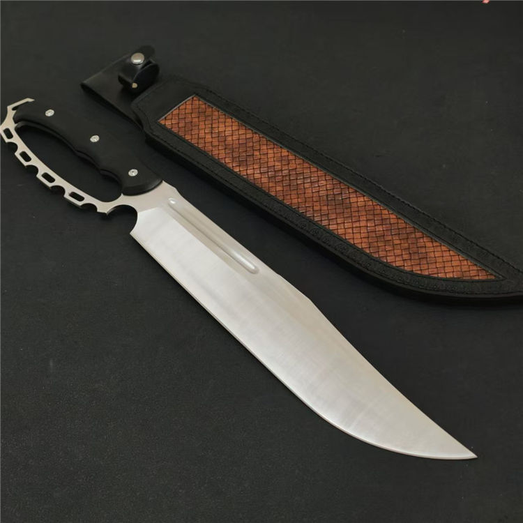 米克黑棘守夜手环直刀 全长:63cm 刃长:39cm 钢材:弹簧钢 柄材:G10 刃宽:7.2cm 刃厚:6mm 柄长:22cm 重量:1360g(皮套226g)