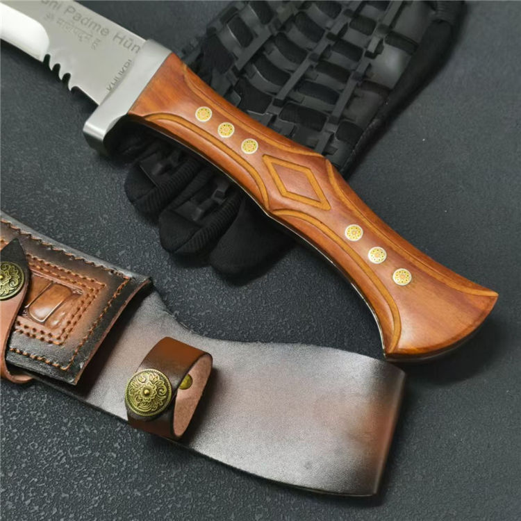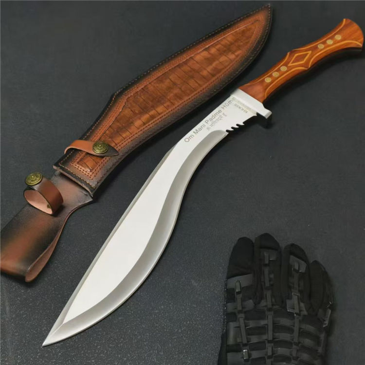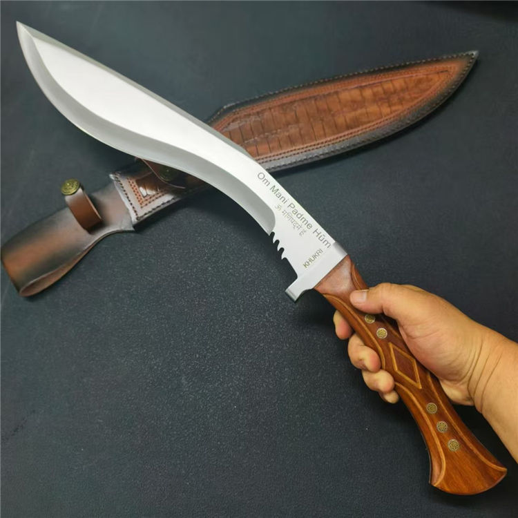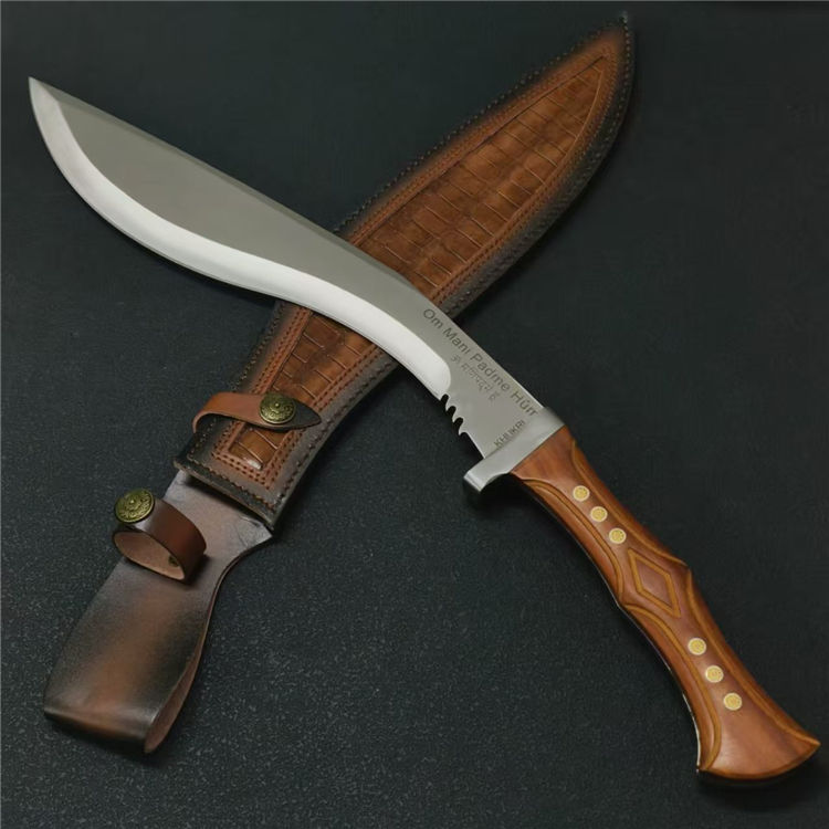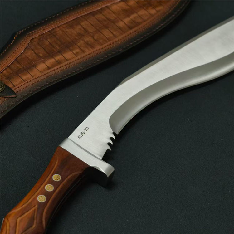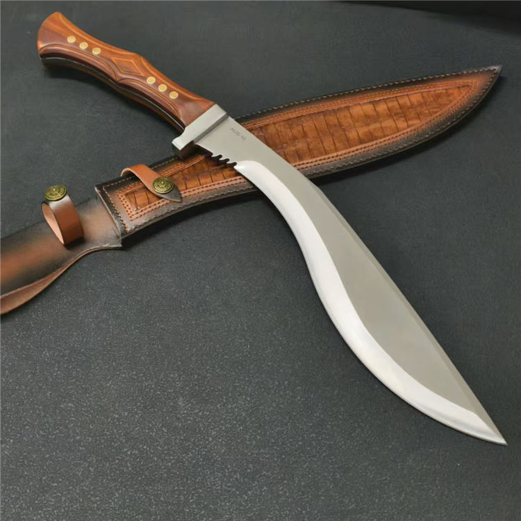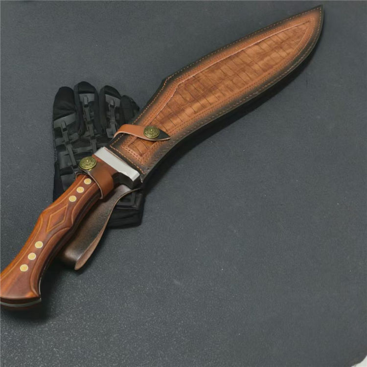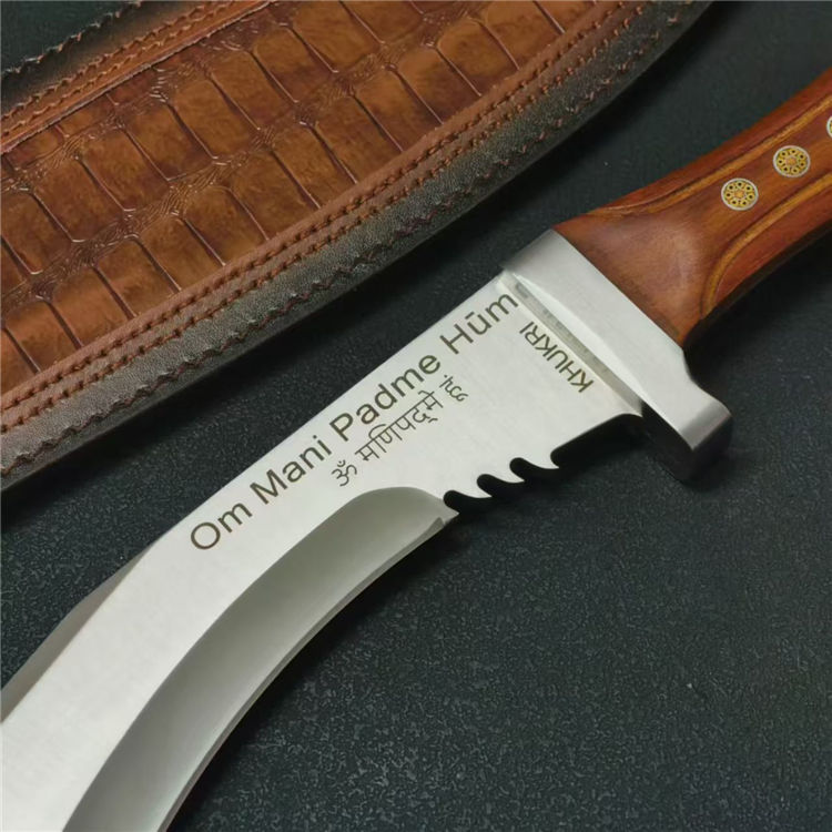 廓尔喀六狮狗腿弯刀 全长:61.7cm 刃长:39cm 刃款:6.6cm 刃厚:6mm 钢材:AUS-10 柄材:红檀木 柄长:22cm 重量:1230G含皮套1429g