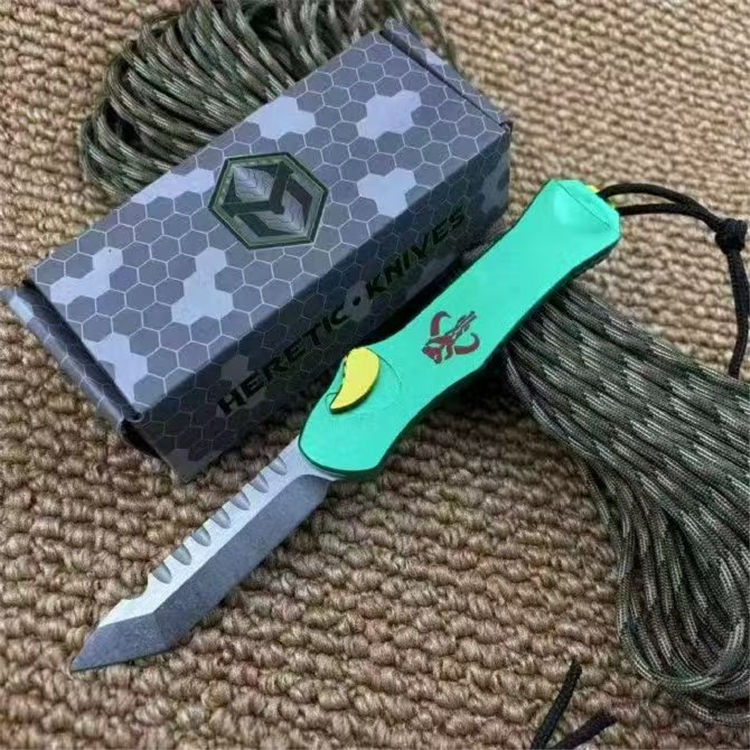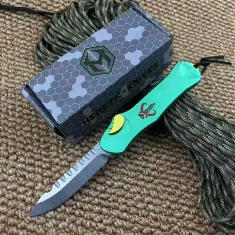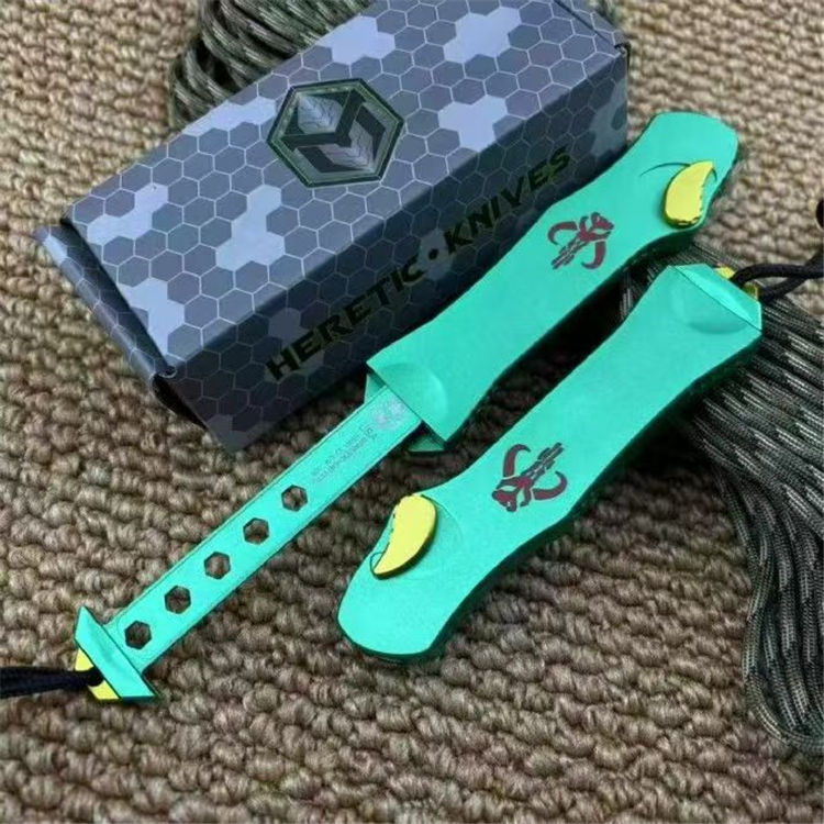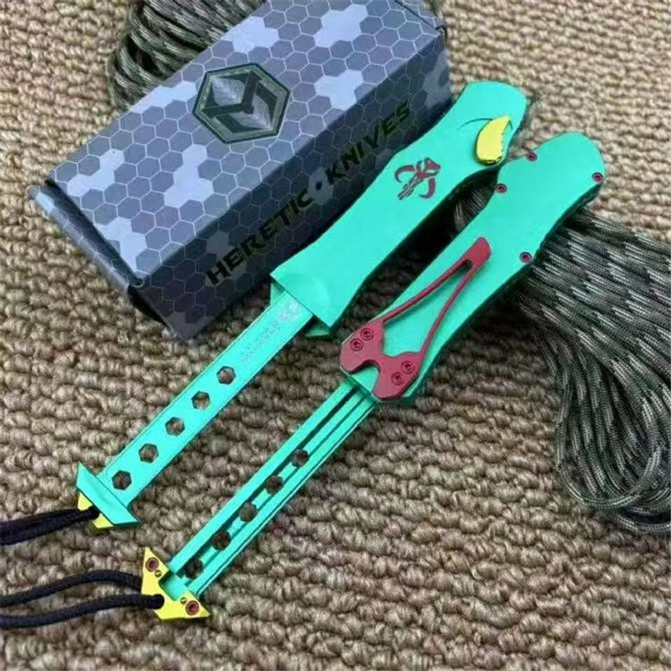 异教徒九头蛇V3直出跳刀 全长:22.9cm 刃材:m390 长度:8.8cm 刃宽:1.98cm 刃厚:0.40cm 柄材:太空铝 刀型:直跳锁定带保险按钮锁 净重:145克 附件:尼龙套