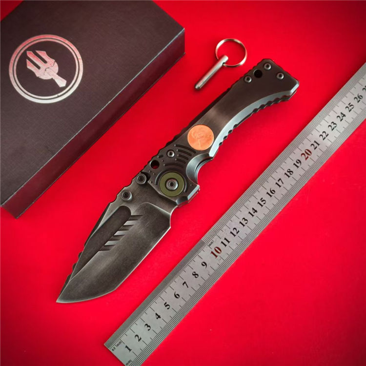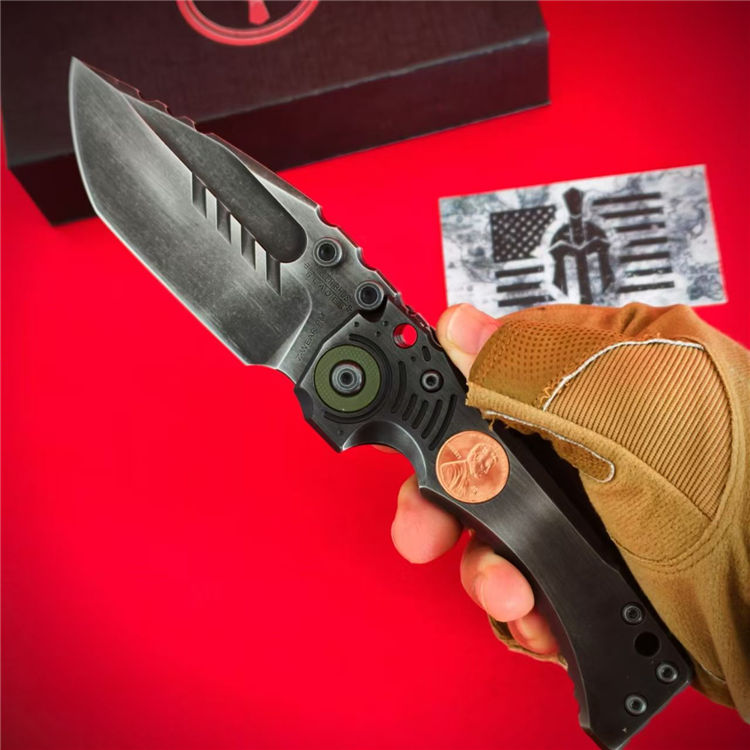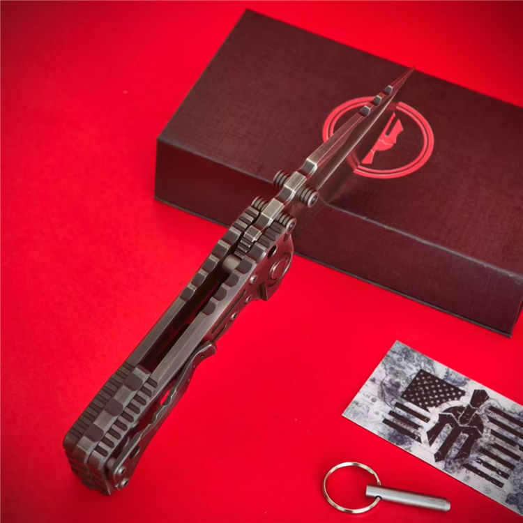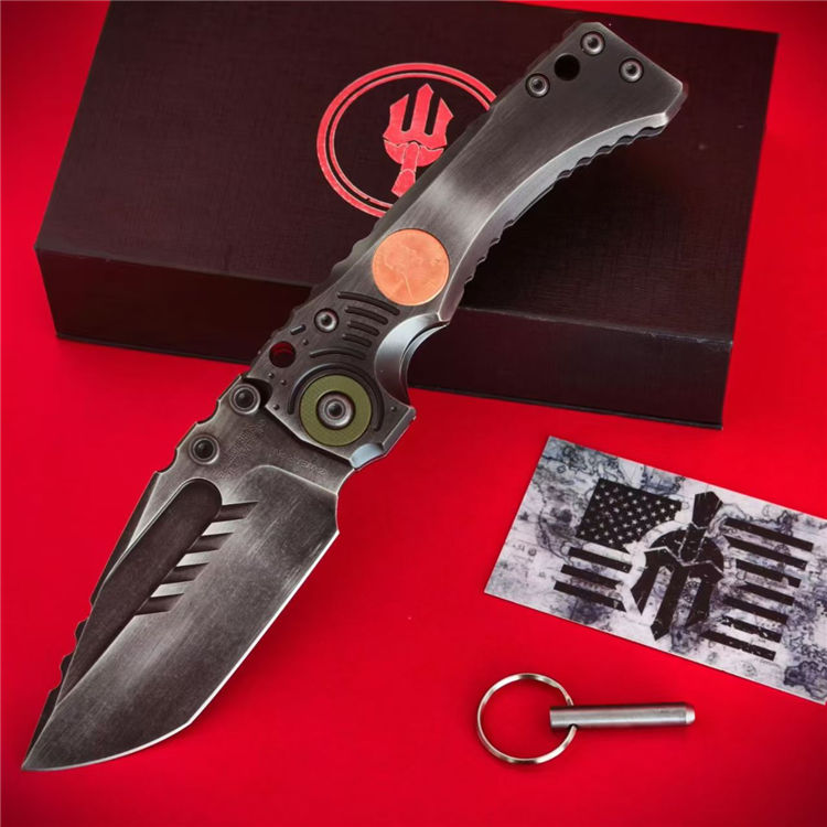 米勒T1林肯重型折刀 全长:23.5cm 刃长:10.5cm 刃厚:0.66cm 刃宽:4.55cm 柄长:13cm 柄厚:2.05cm 柄宽:4.04cm 刃材:VG10 柄材:TC4钛合金,手工+CNC 刀夹:TC4钛合金手工+紫铜林肯硬币 重量:368.1g 硬度:59-60HRC 结构:钢片锁定 轴承系统:滚珠轴承 表面效果:镀钛发黑石洗做旧 包装重量:505g