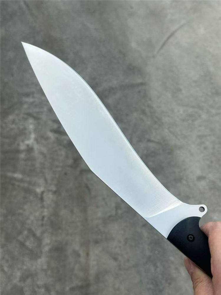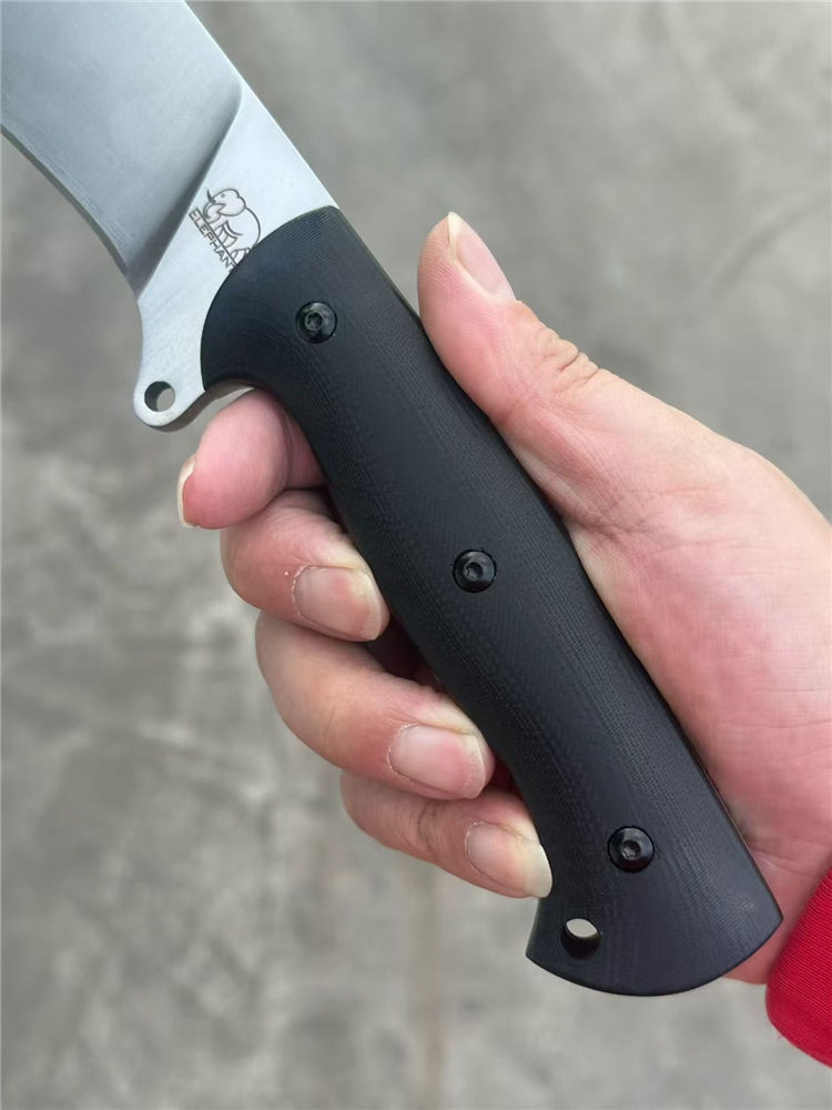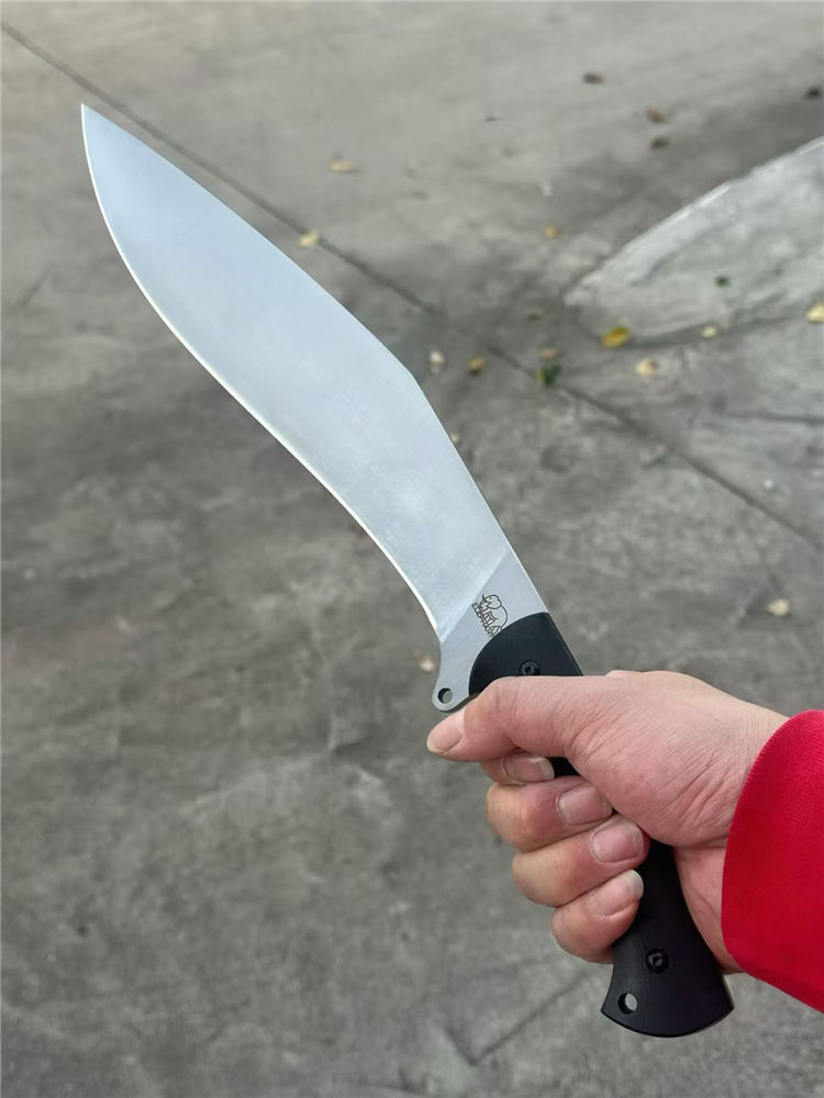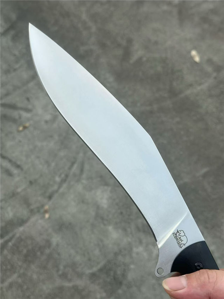 大象狗腿弯刀 全长:420mm 刃长:270mm 刃宽:53mm 柄长:140mm 材料:AUS-8钢 硬度:60HRC 厚度:6.5mm 表面:钢本砂光 手柄:黑色G10柄 cnc精细加工+数控v磨