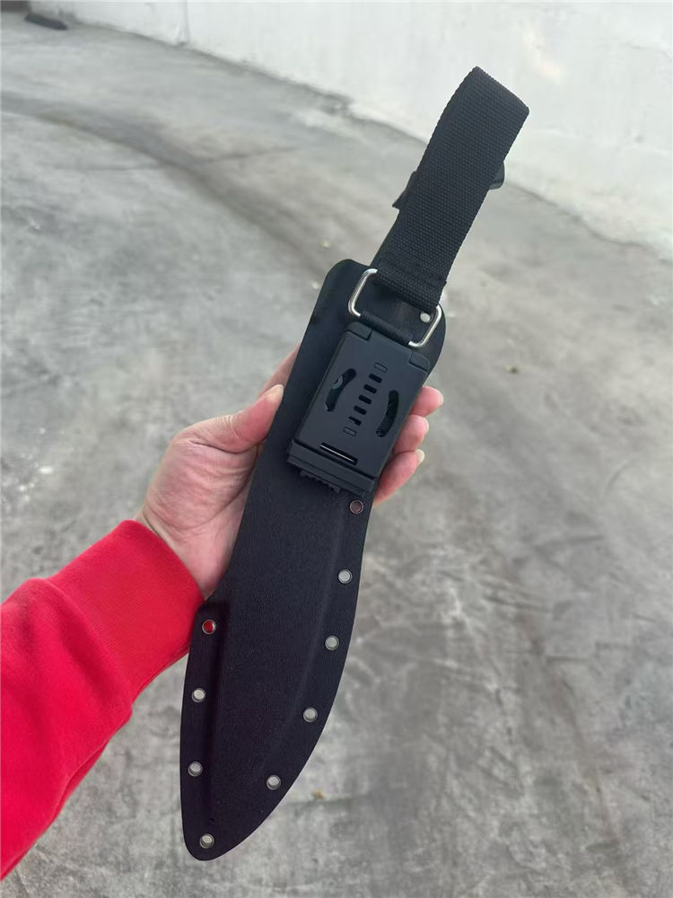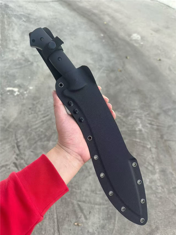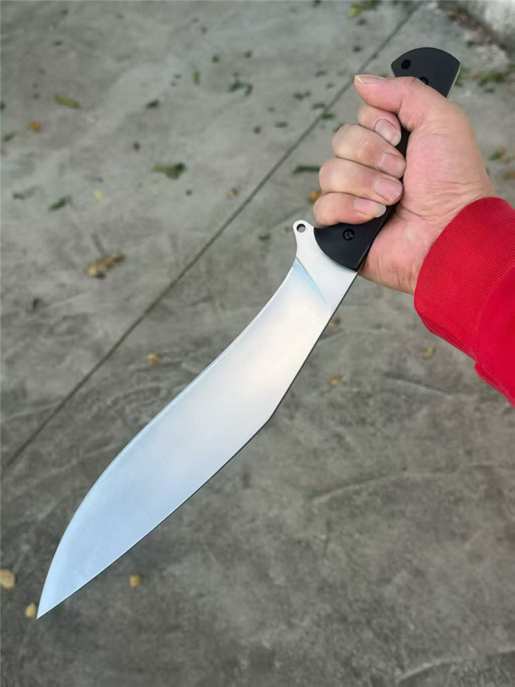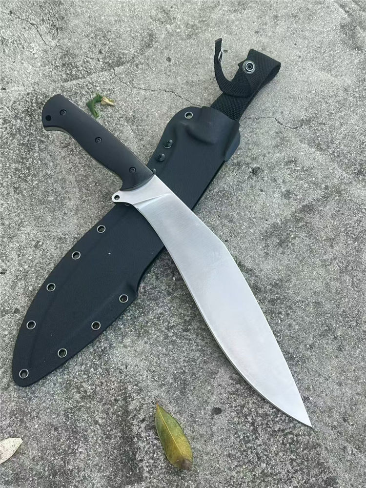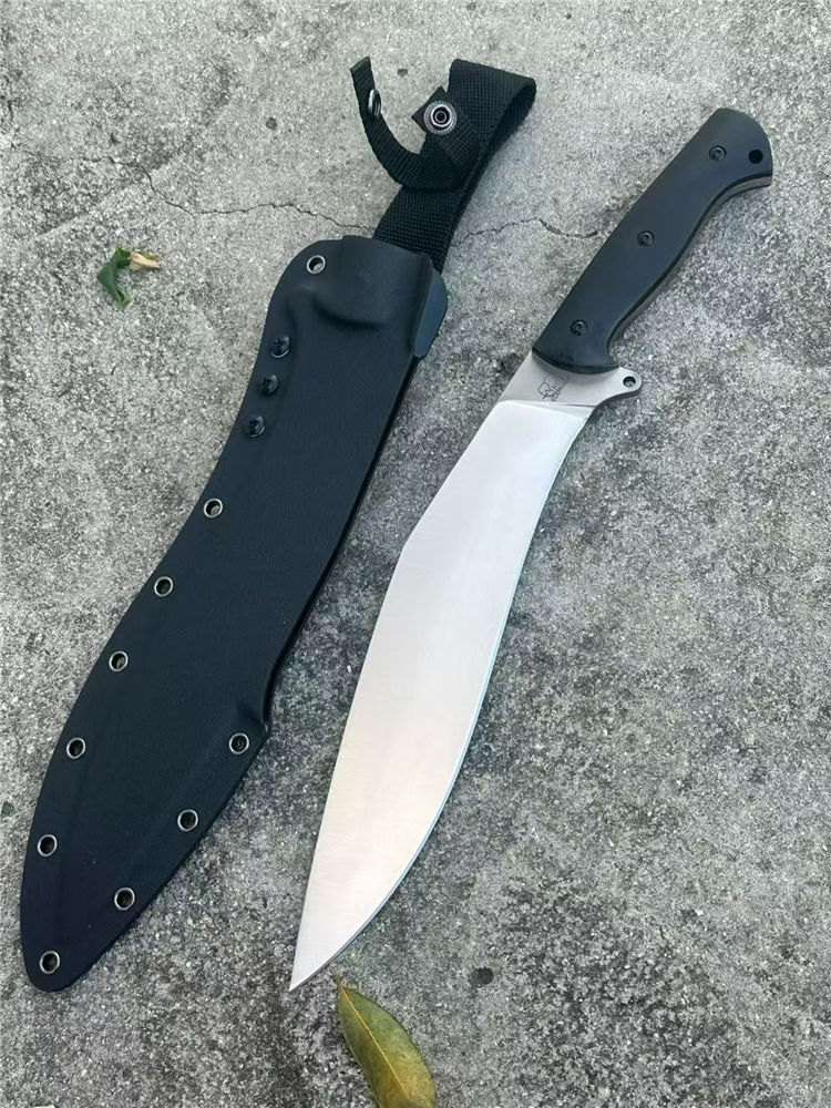 大象狗腿弯刀 全长:420mm 刃长:270mm 刃宽:53mm 柄长:140mm 材料:AUS-8钢 硬度:60HRC 厚度:6.5mm 表面:钢本砂光 手柄:黑色G10柄 cnc精细加工+数控v磨