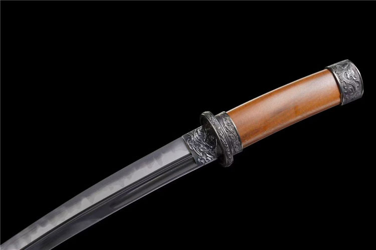 12寸T10烧刃黑铁乌丸武士刀 全长:55cm 刃长:33cm 柄长:17cm 刃宽:3.2cm 刃厚:0.6cm 重量约:0.76KG 刃材:高性能T10烧刃上研,纯铜精雕发黑套装 手柄:龙凤檀、龙凤檀木鞘搭配精美下绪 特点:钢材T10钢材锻打,开子母血槽,采用古法覆土烧刃淬水工艺,手工17道精致水磨,高硬度,刚性强