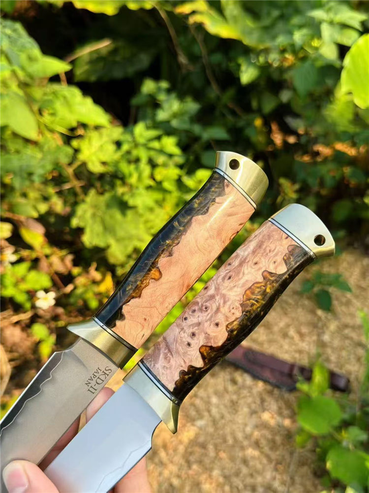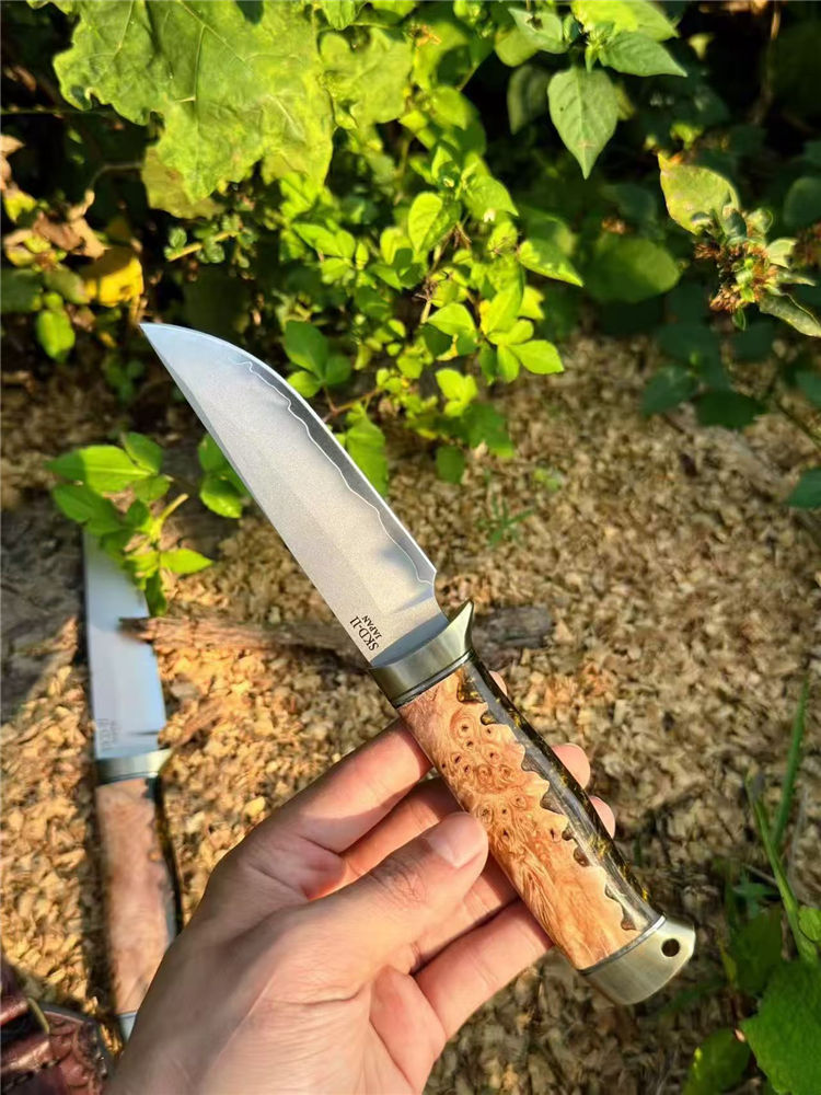 雷蛙手工直刀 全长:22.7cm 刃长:11.1cm 柄长:11.6cm 刃宽:2.87cm 刃厚:3.6mm 硬度:62HRC 钢材:进口日本SKD-11钢(一体龙骨) 柄材:树脂融合枫木(流沙金色) 皮套:意大利进口植糅皮 重量:184.6g 包装:黑色手工硬盒