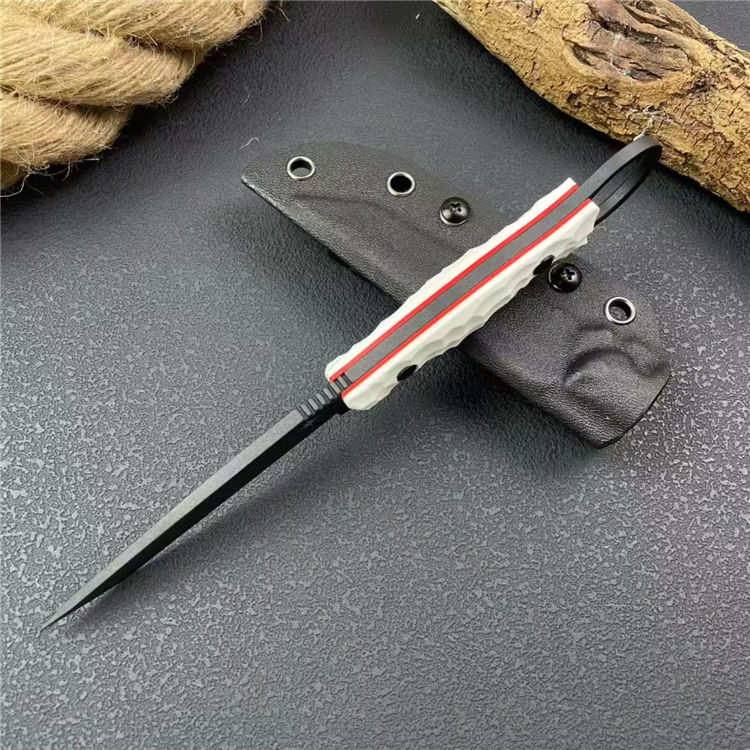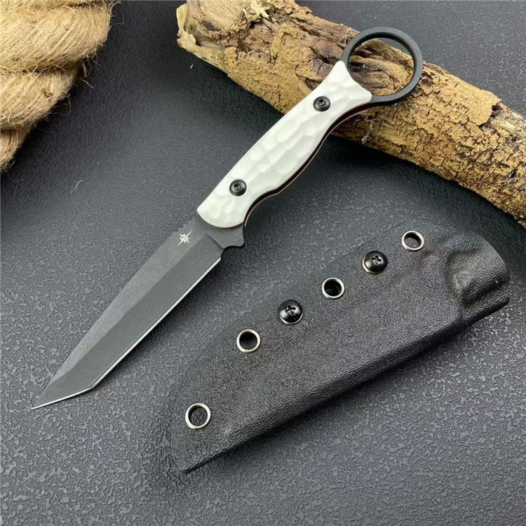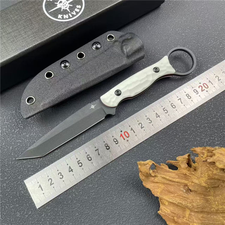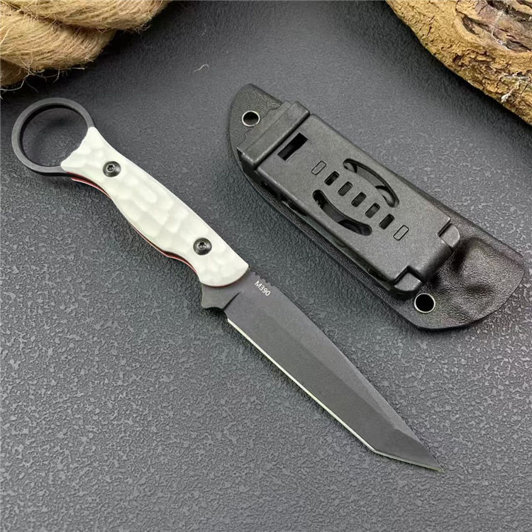 圣地亚哥白月指环直刀 全长:20.8cm 刃宽:2.2cm 刃长:9cm 柄长:11cm 刃厚:4mm 刃材:M390 柄材:钢片+G10 刀重:110G/168G 毛量:245G 硬度:58-60HRC
