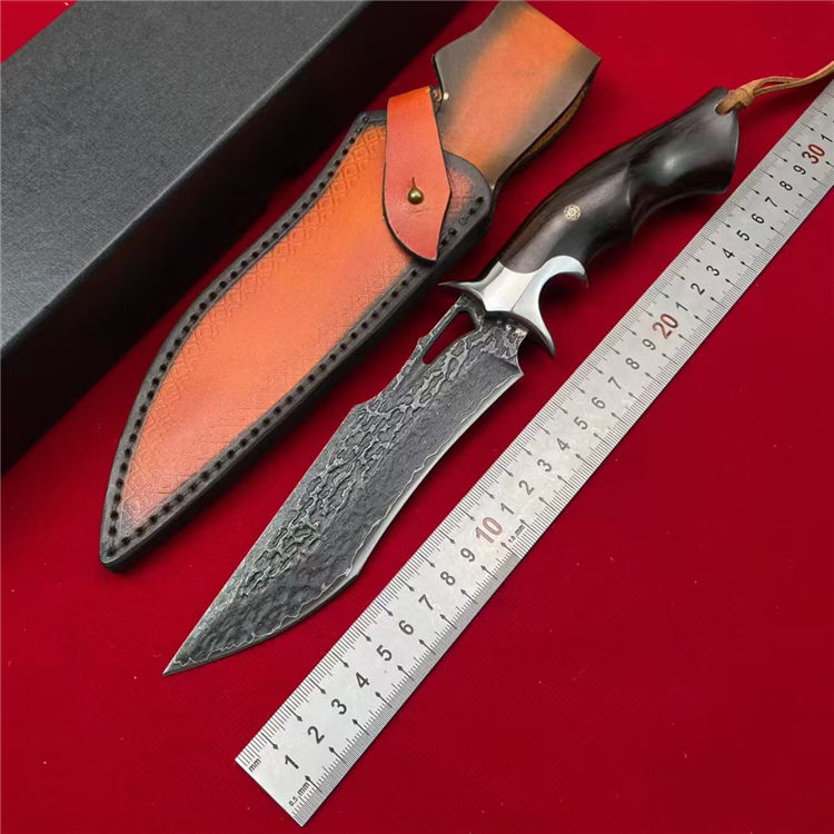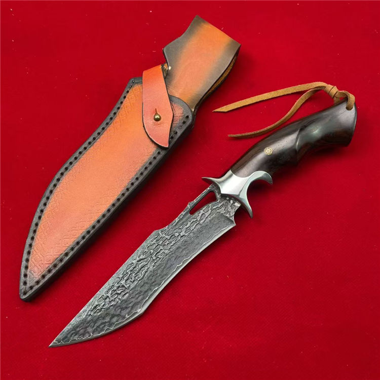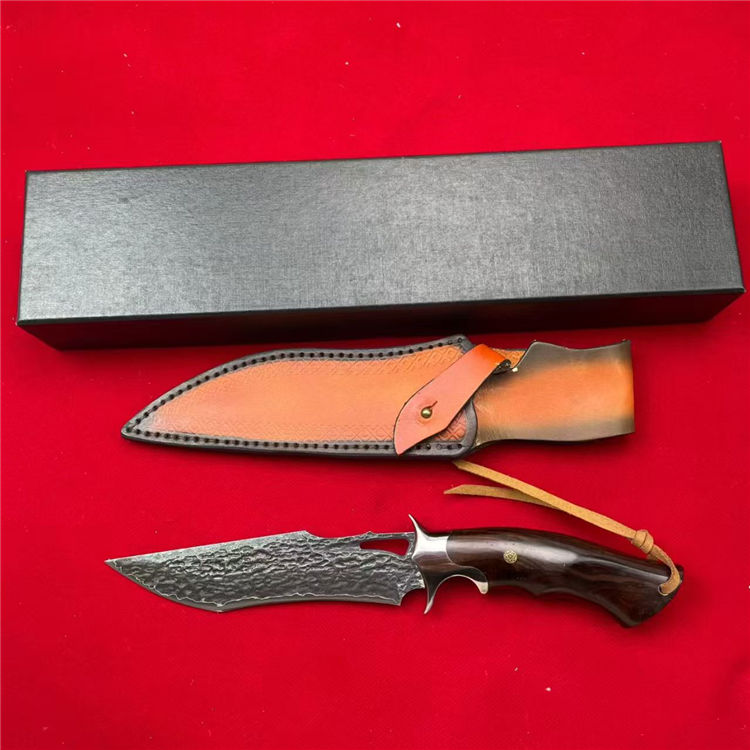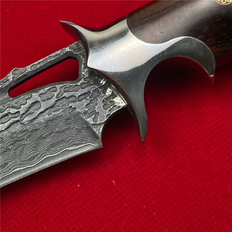 大马士革天马直刀 全长:28cm 刃宽:3.5cm 刃长:14.8cm 柄长:12.5cm 刃厚:4.5mm 刃材:大马士革钢 柄材:钢+檀木 刀重:225G/300G(含皮套) 毛量:367G 硬度:59-60HRC 包装:皮套+盒