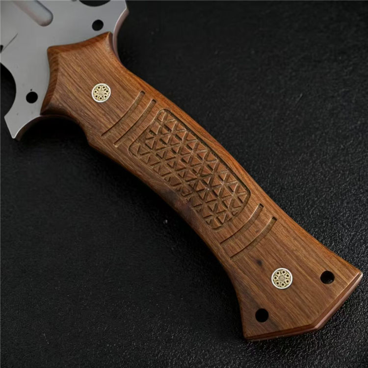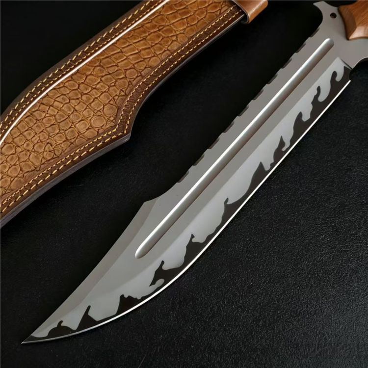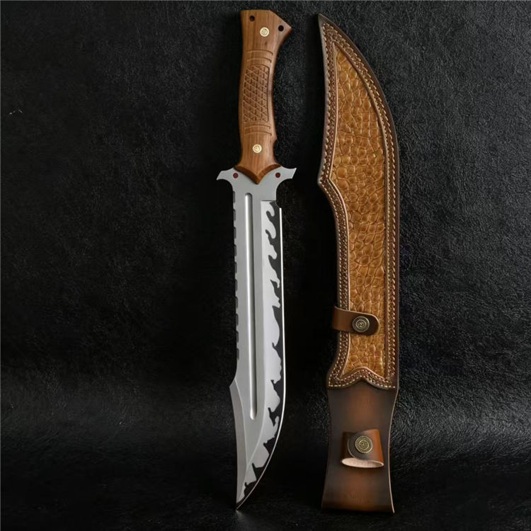 黑豹开山直刀 全长:50cm 刃长:31cm 刃厚:5.5mm 刃宽:5.7最大值 钢材:AUS-11 柄材:红檀木 柄长:16.5cm 重量:790g(含皮套949g)