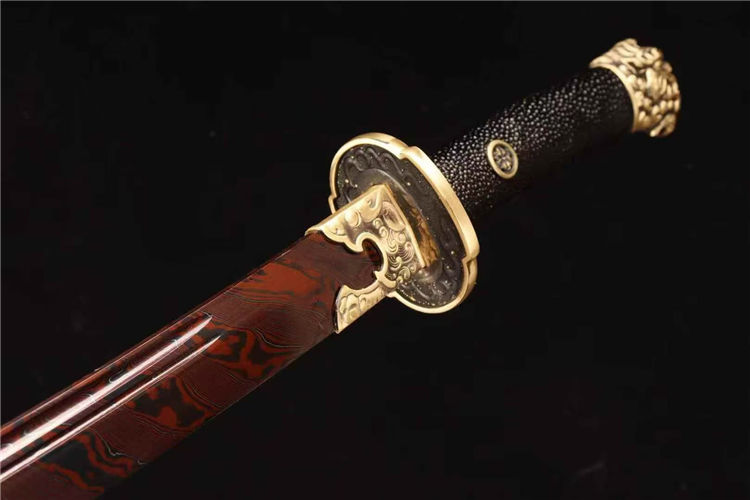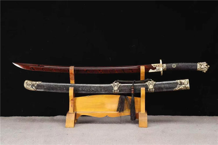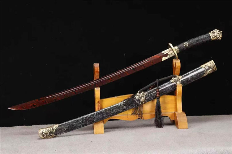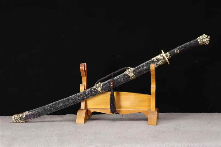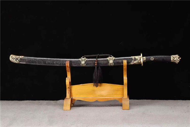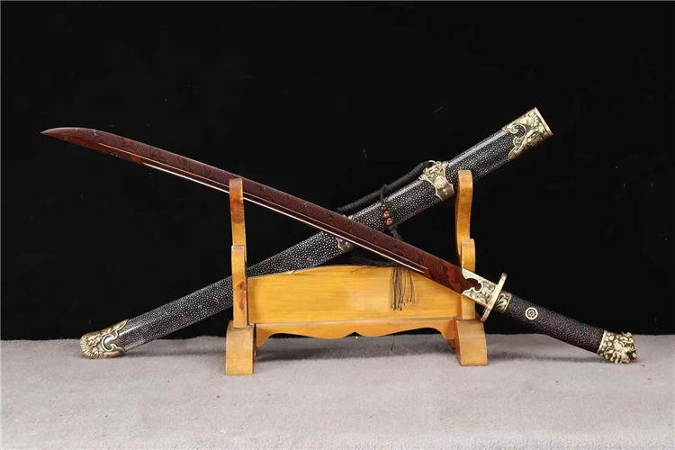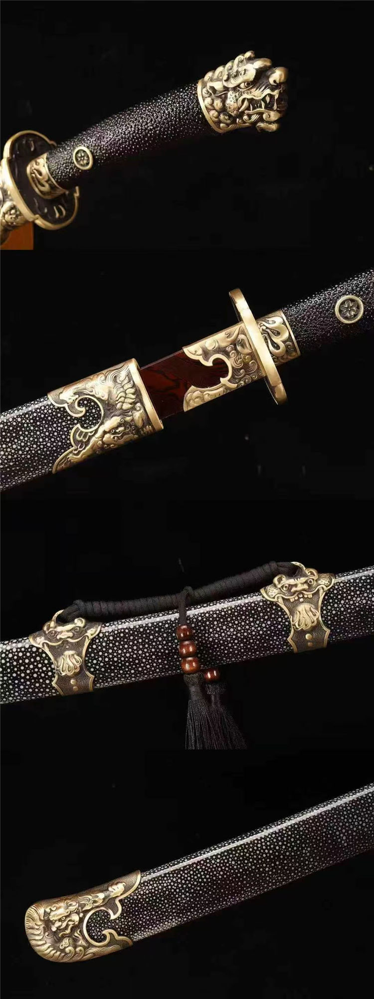 青狮鱼皮绣春刀 总长:98cm 刃长:72cm 柄长:20cm 刃宽:3.6cm 刃厚:0.7-0.5cm 刃材:大马扭转钢 硬度:59HRC 鞘材:珍珠鱼皮 装具:铜装 总重:约1950克 净重:约1100克 刃身:一体锻打刀身 工艺:刃身手工锻造,经过打坯、热煅、铲、锉、研磨、粹火,回火、手工研磨等龙泉刀剑古法制造工序制作而成 性能:断水水瓶,草席或过竹子消纸 注:刀剑为纯手工产品存在误差,规格
