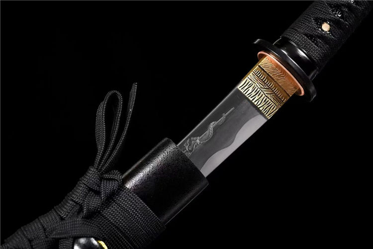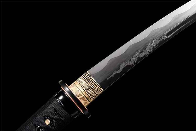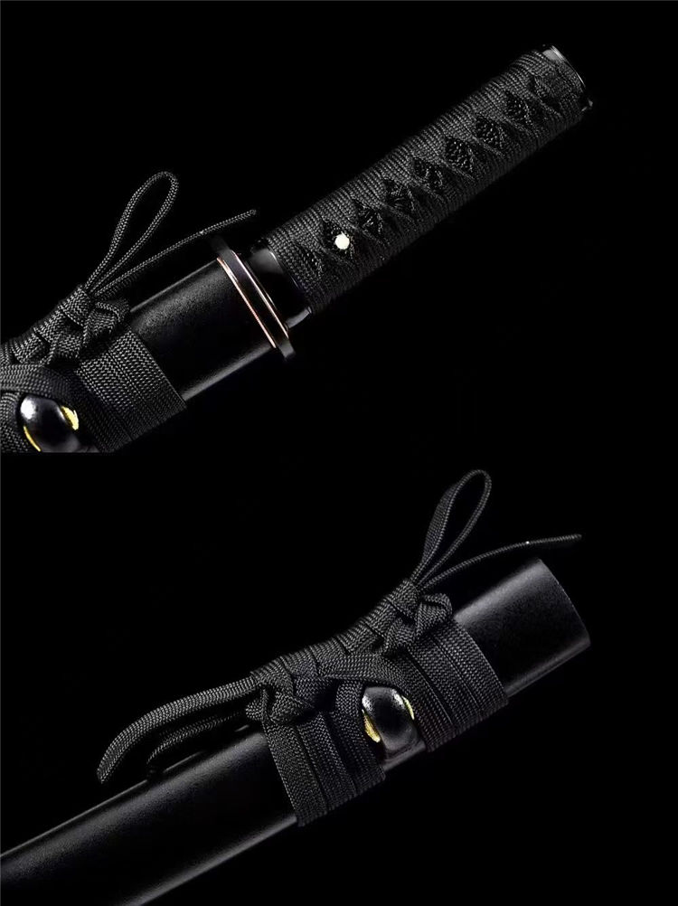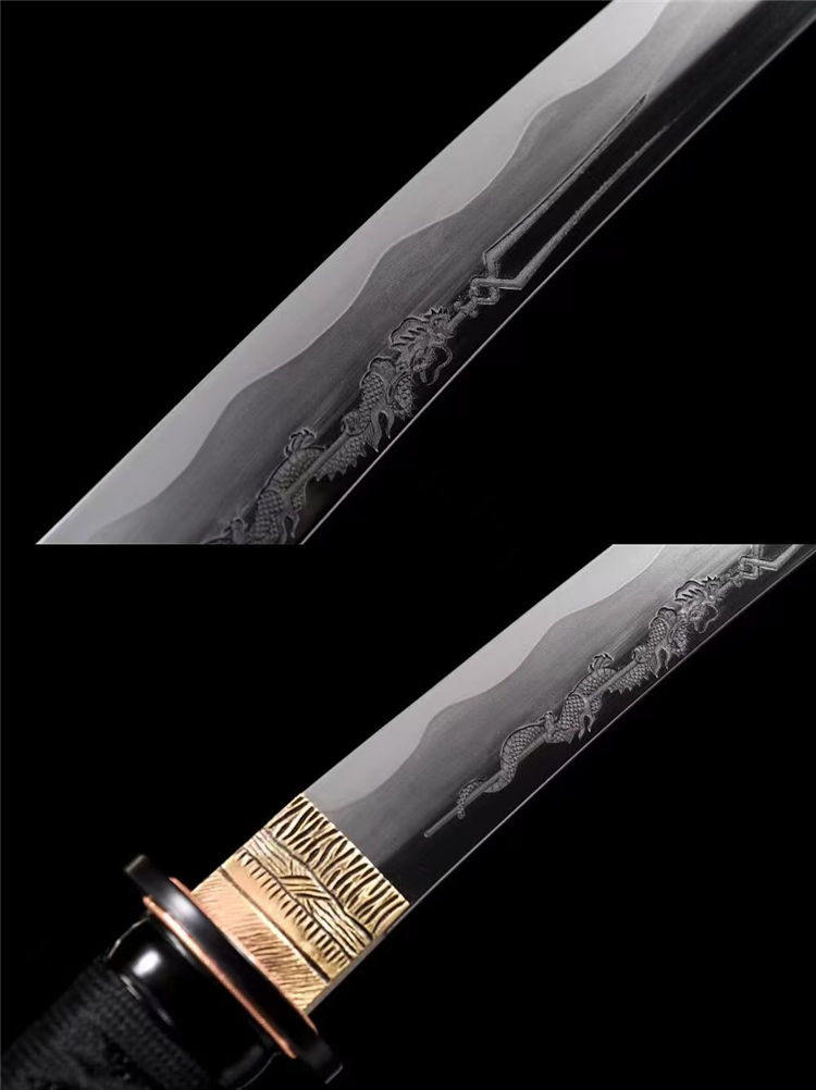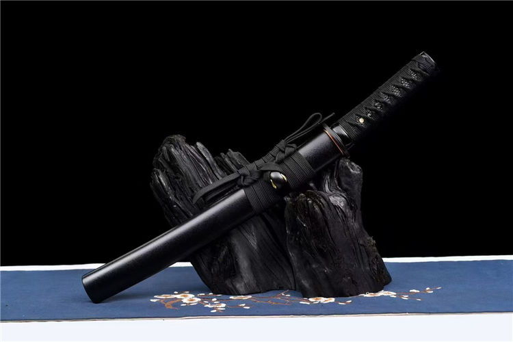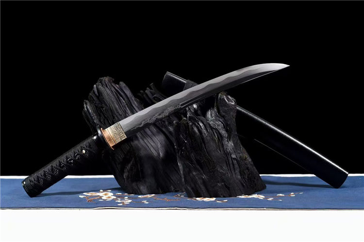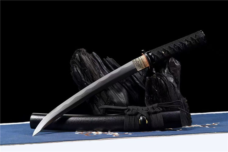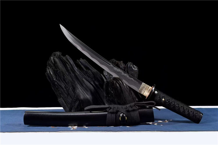T10烧刃三色研磨绝杀短刀 全长:55cm 刃长:33cm 柄长:17cm 刃宽:3.2cm 刃厚:0.7cm 重量:0.7㎏ 装具:铁镡,手柄手工绕绳,实木大漆鞘搭配精美下绪 赠高端锦盒