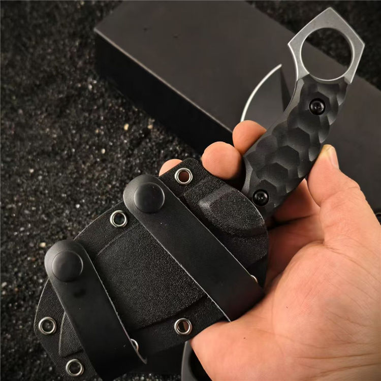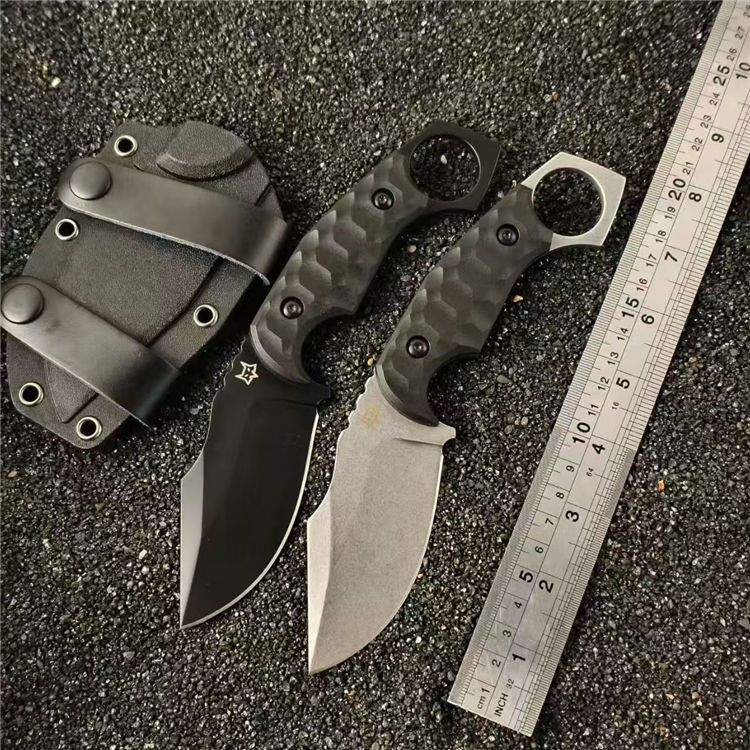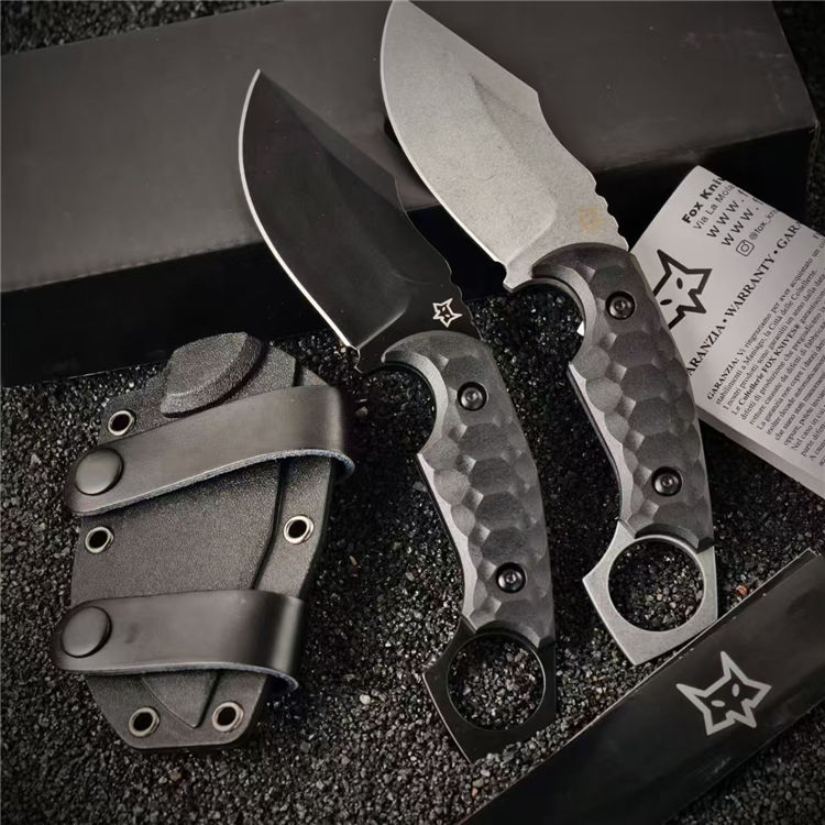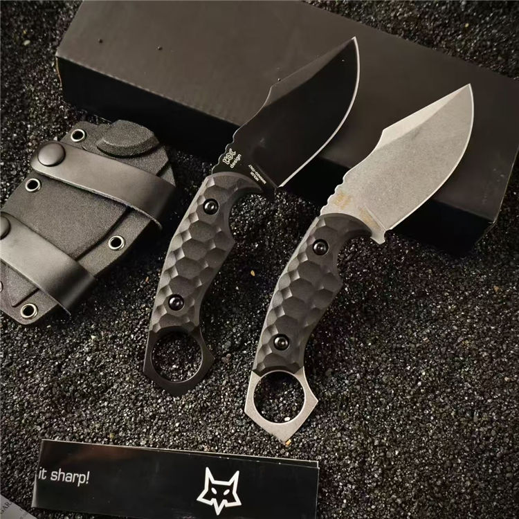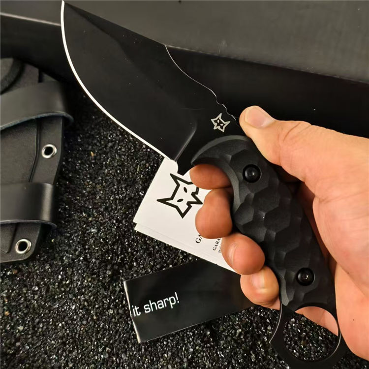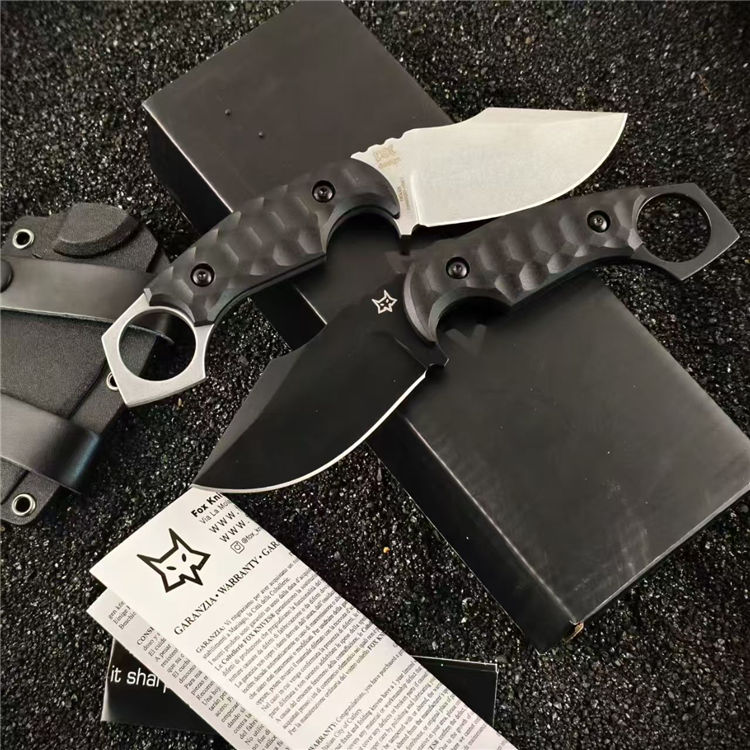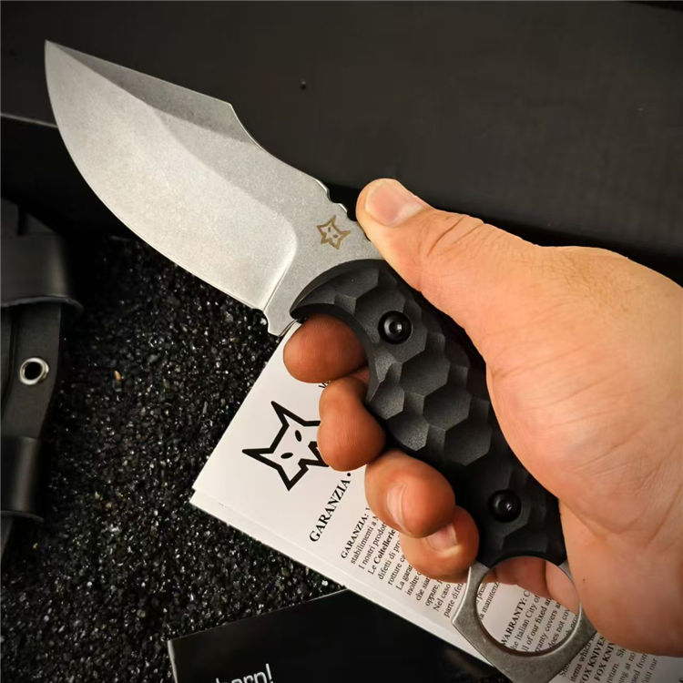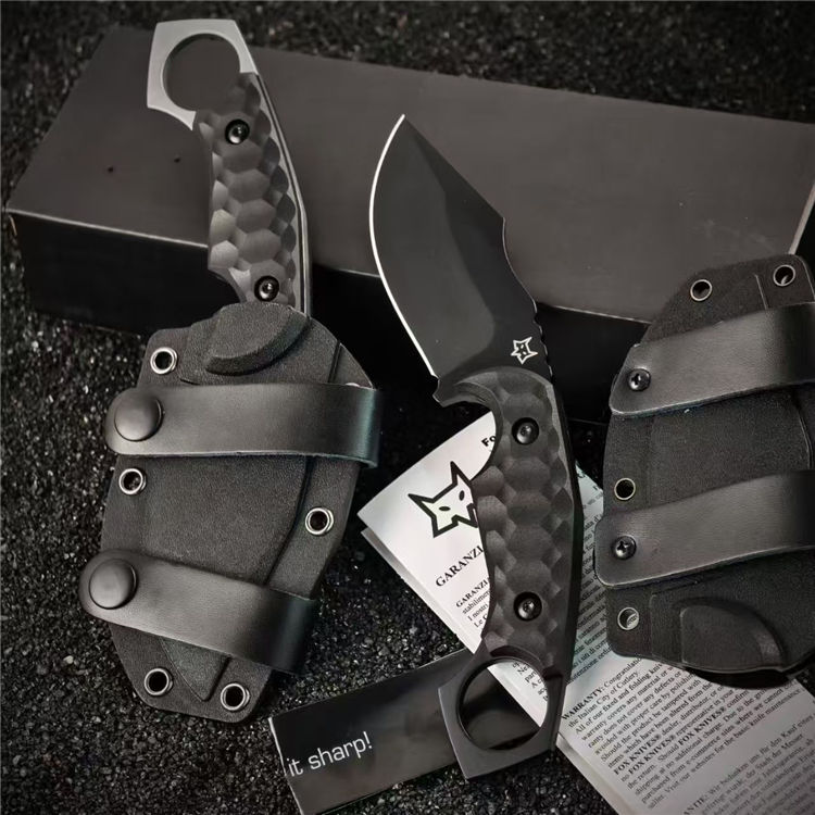 狐狸FX633直刀 全长:205mm 刃长:90mm 柄长:115mm 刃宽:42mm 刃厚:4mm 刃材:N690Co钢司公提供 刀重:180g/233g(含鞘) 毛重:286g 硬度:58-59HRC 表面:黑钛 柄材:ABS工程塑料 结构:一体龙骨成形 配套:K鞘 包装:原装礼盒(出版口简包)