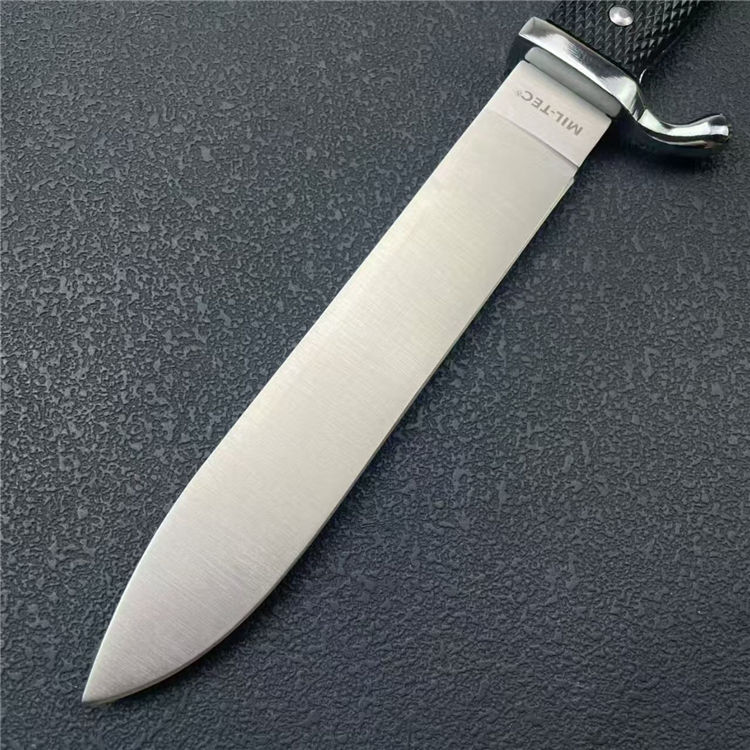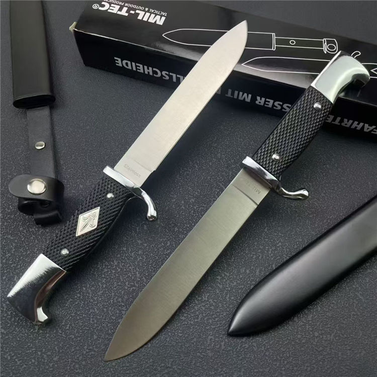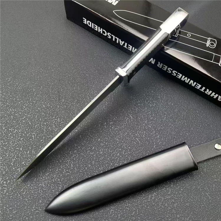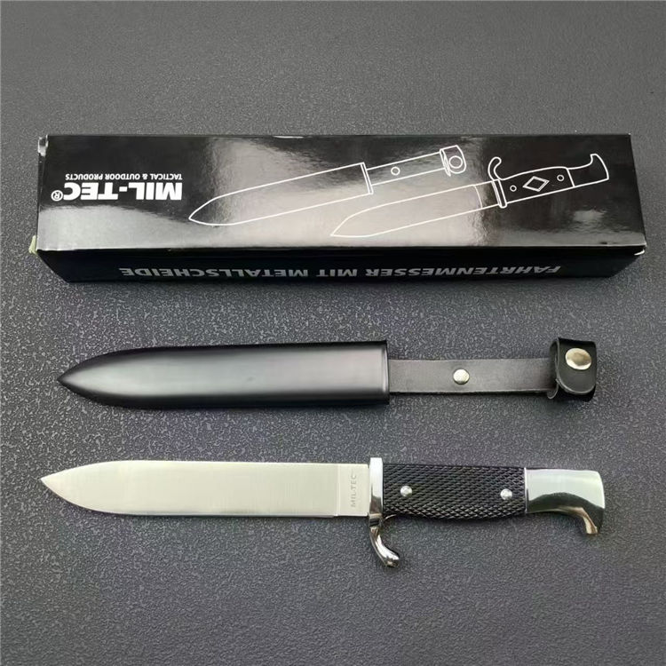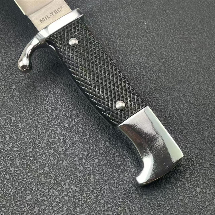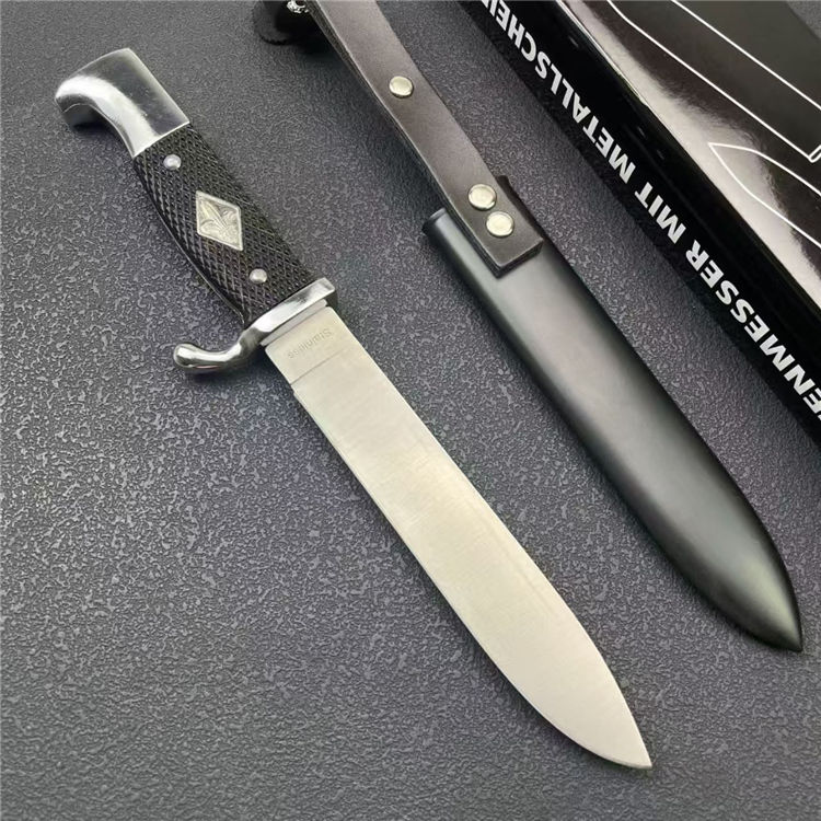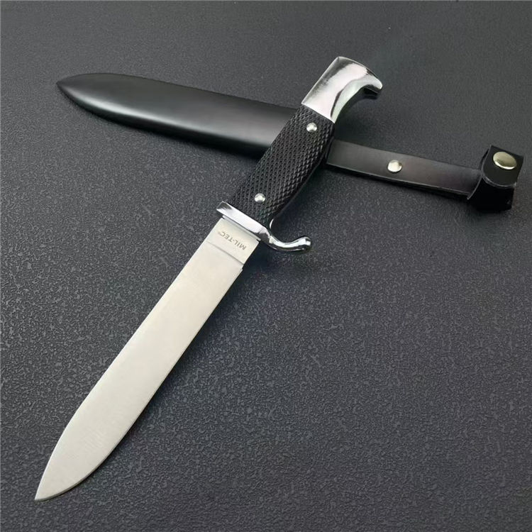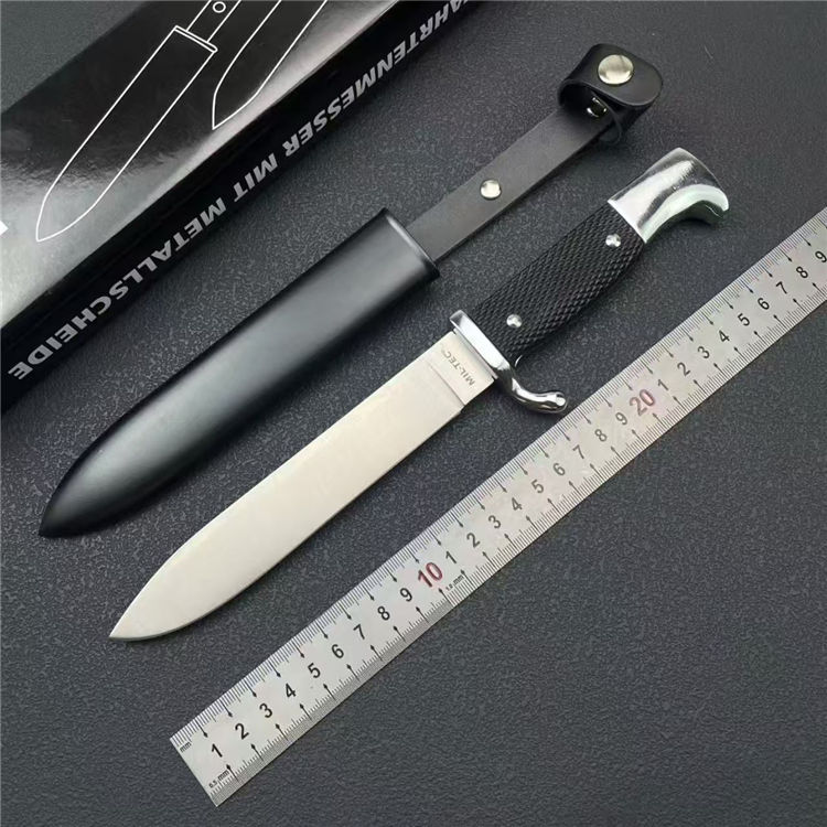 德国党卫军指挥直刀 全长:27cm 刃宽:2.5cm 刃长:14.2cm 柄长:11cm 刃厚:2.3mm 刃材:9R18MOV 柄材:一体钢+高级工程ABS 刀重:193G 毛量:345G 硬度:58-60HRC 包装:锌铝合金压铸+彩盒