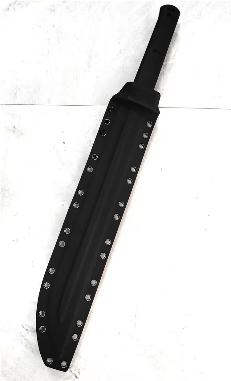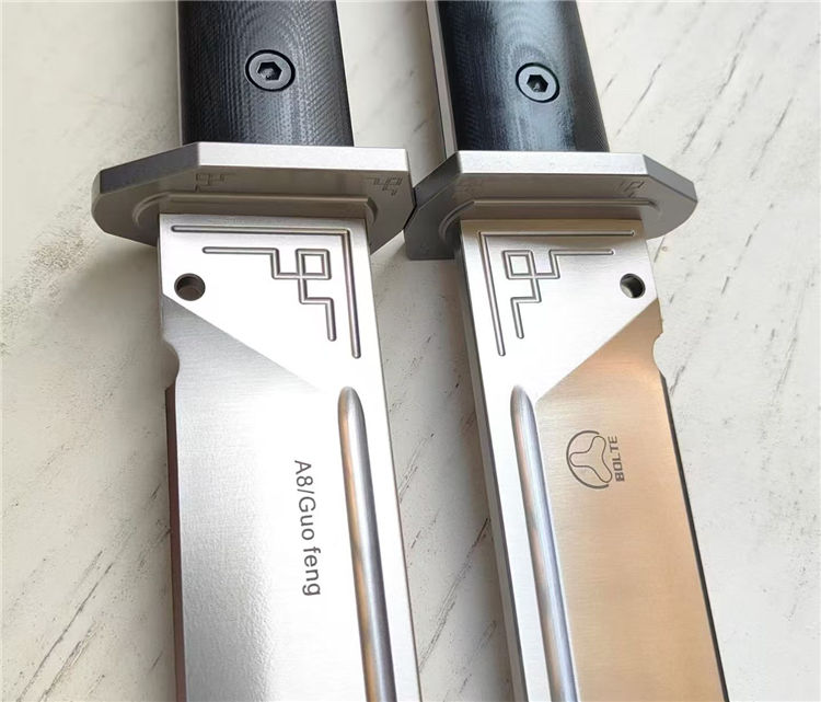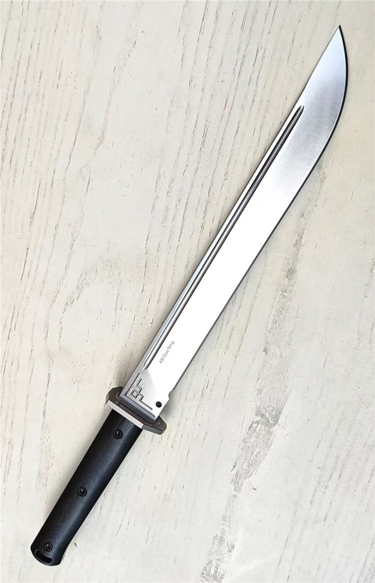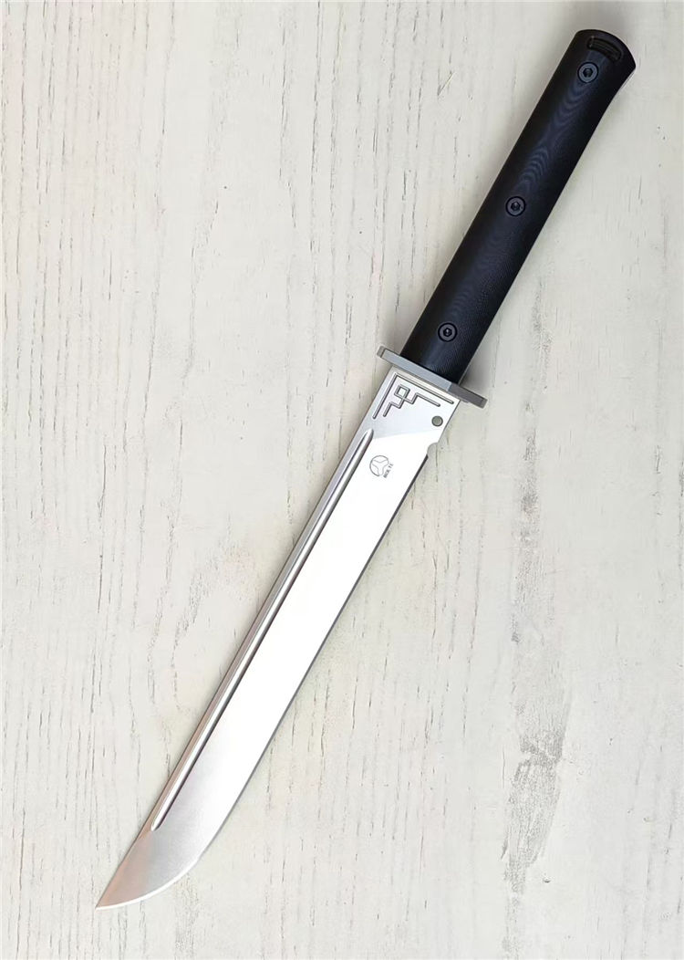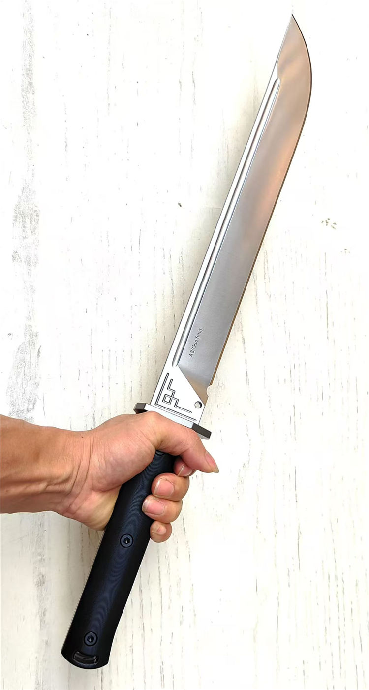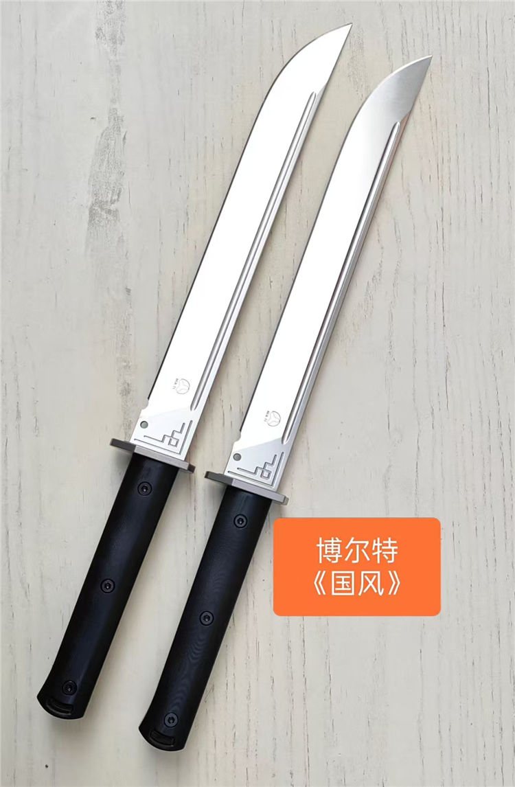 博尔特国风排障刀 全长:581mm 刃长:386mm 柄长:195mm 刃宽:43mm 刃厚:5.8+-0.05mm 刃面:钢本砂光,护手石洗3cr13不锈钢cnc精雕 类型:具有硬度高,锋利度,韧性保持度高的优势 开刃:二次开刃 刃材:A8合金模具钢 热处理:真空热处理和2次回火处理使钢材韧性保持性更佳 硬度:61+-0.5HRC 柄材:黑色G10+强螺丝,一体贴片柄、握感舒服可拆装 包装:精美黑礼盒,赠刀油、伞绳 净重:980+-10克 刀鞘:2.Ok鞘配夹子赠背带