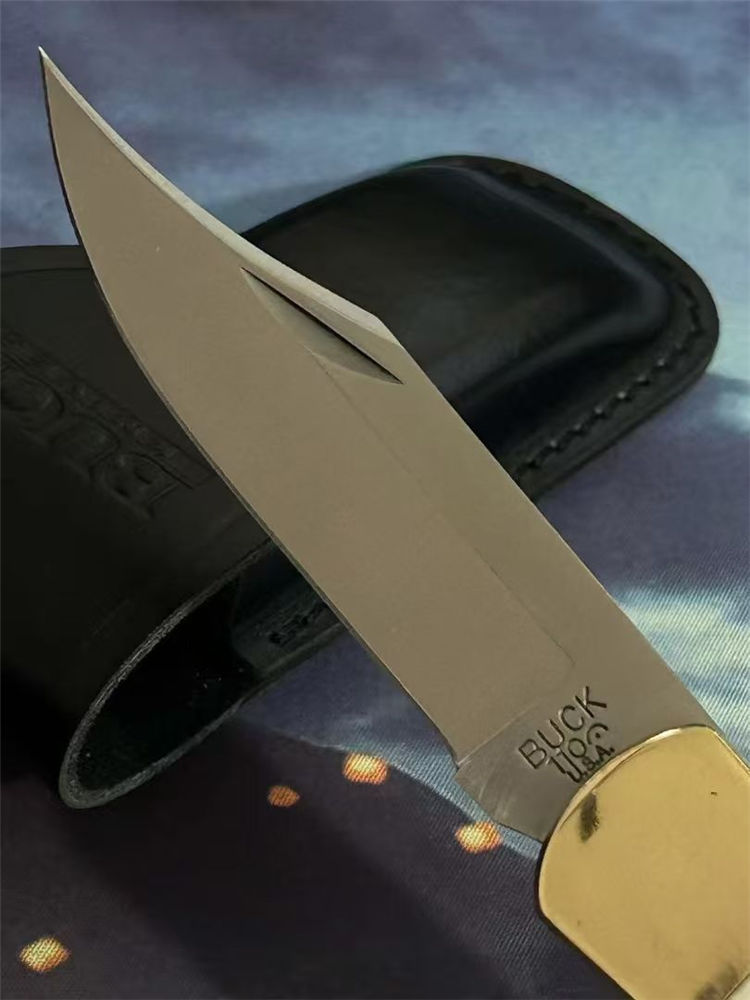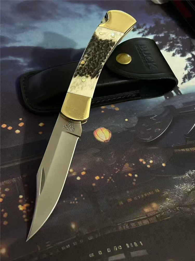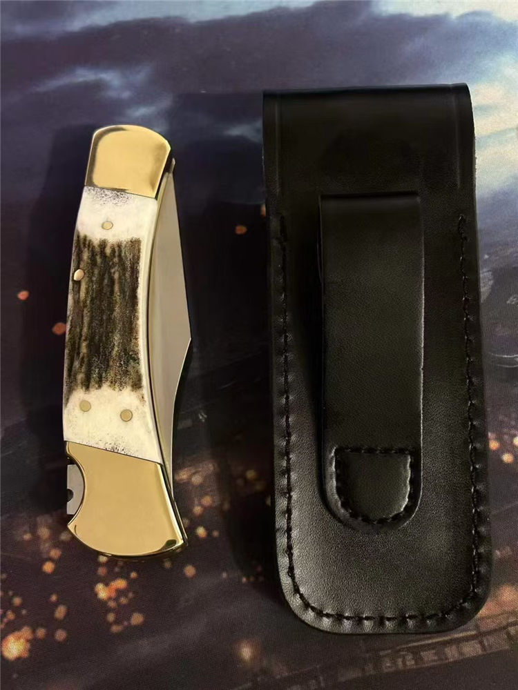 巴克110鹿角柄背锁折刀 全长:21.5cm 柄长:12cm 刃长:8.5cm 刃宽:2.2cm 刃材:进口440C钢 刃厚:0.3CM 硬度:58-59HRC 手柄:一体CNC黄铜柄+鹿角贴片 净重:242克+- 包装:真皮套