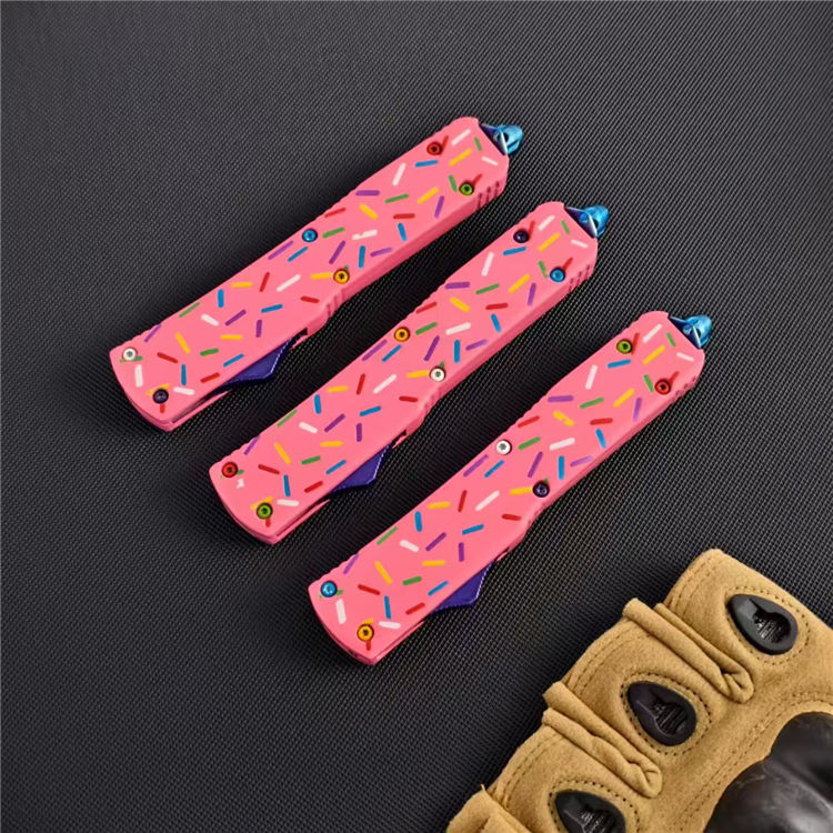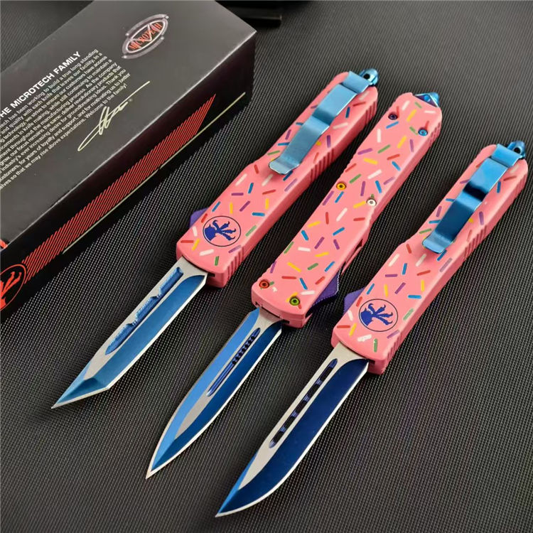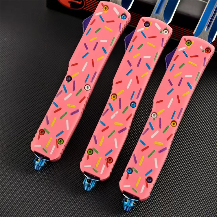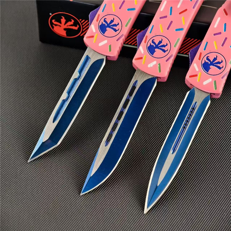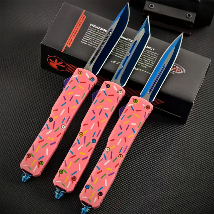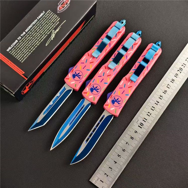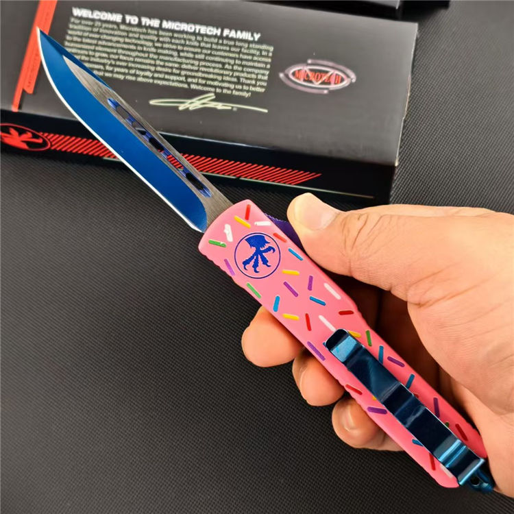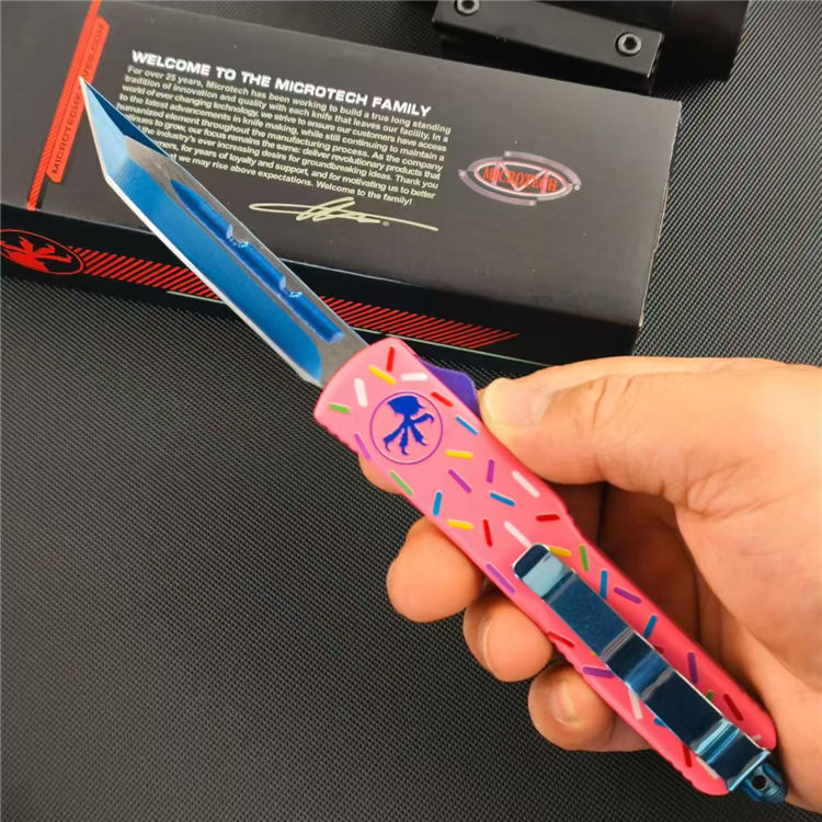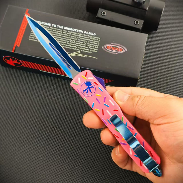 甜甜圈UTX85直出跳刀 全长:21.5cm 刃长:8.6cm 柄长:12cm 刃宽:1.6cm 刃厚:0.3cm 刃材:D2钢 柄材:铝合金 刀型:直跳 刀重:95克 重量:163克(含包装)