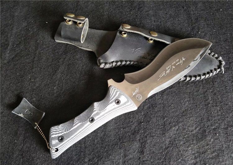 克里斯里夫致命复仇者手签版 全长:35.5cm 刃长:18cm 刃宽:6.2cm (最宽处) 刃厚:0.62cm 刃材:5Cr15 硬度:57HRC 柄长:15.8cm 刀重:760克 总重:1380克(含包装物) 柄材:米克塔 表面:钛离子 包装:经典木合(配备用螺丝钉和螺母、刀石)