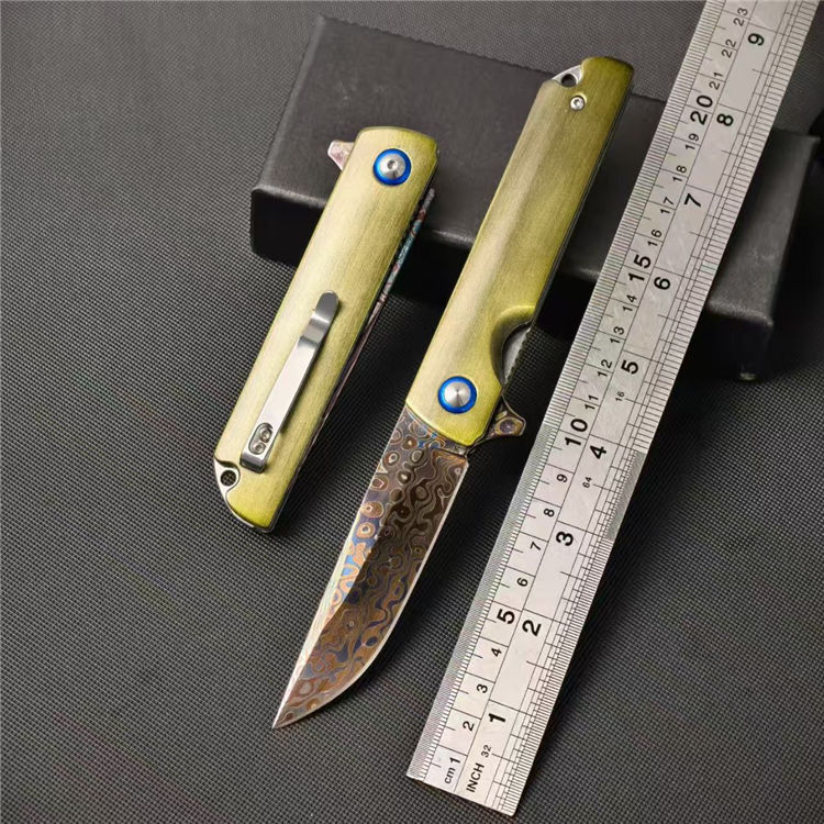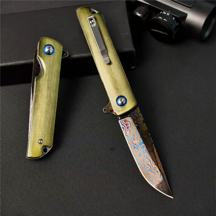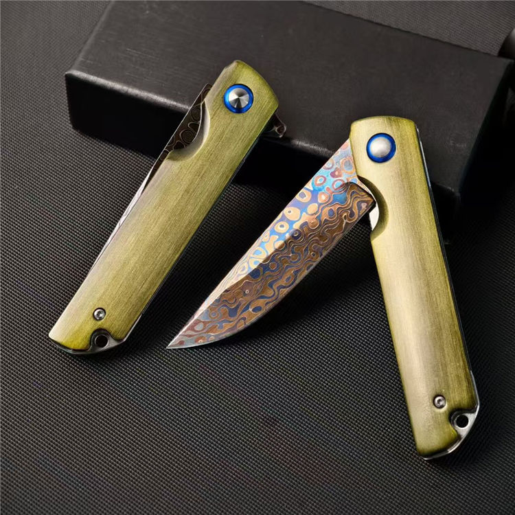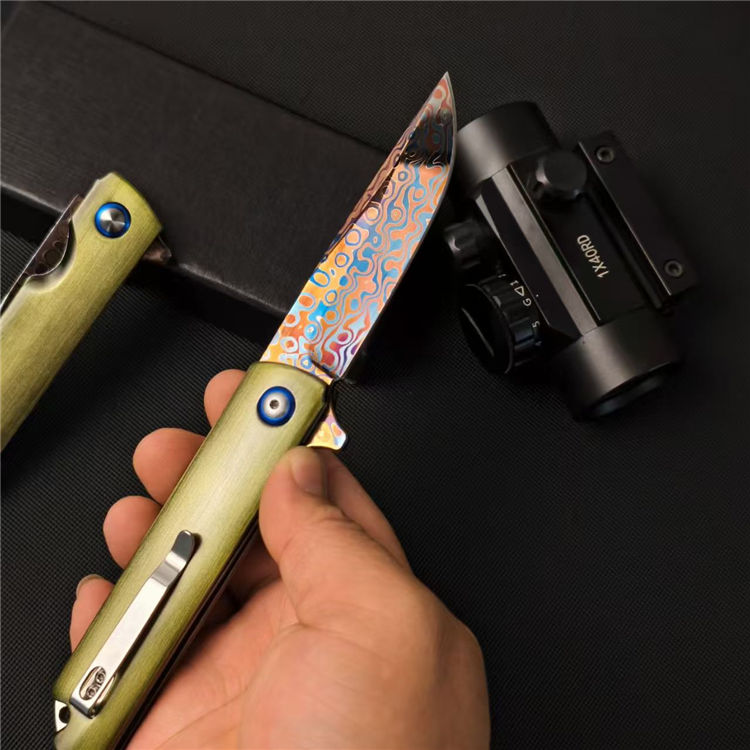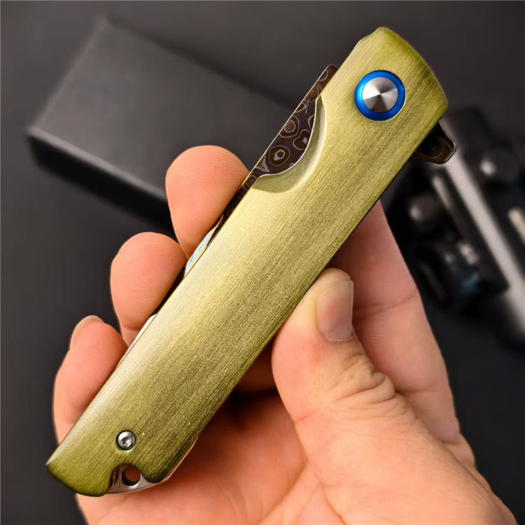 大马士革青焰折刀 全长:22cm 刃长:8.7cm 柄长:11.4cm 刃宽:2.2cm 刃厚:3mm 柄材:铝合金(拉丝) 钢材:碳钢大马烤蓝 重量:126g 包装重量:175g