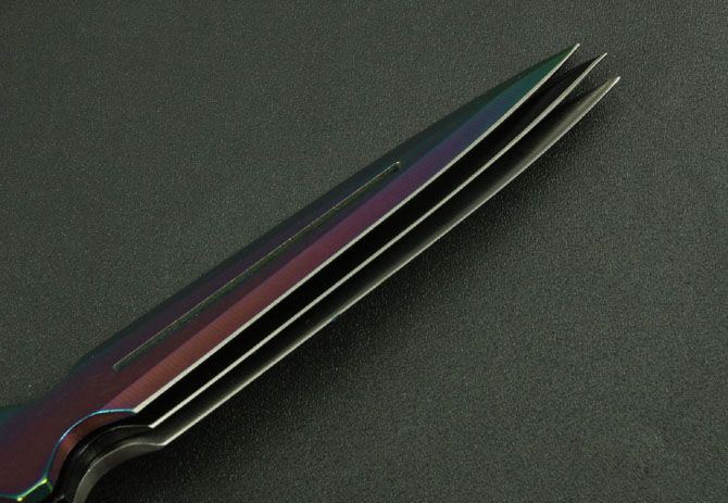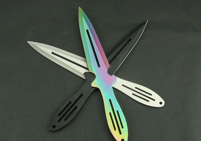 钢材:3Cr13Mov 长度:25.8cm 刃宽:3cm 刃厚:2.8cm 柄长:10cm 总重:290g(含包装) 表面:黑色 白色 彩色 刀套:尼龙套 其它:三支装
