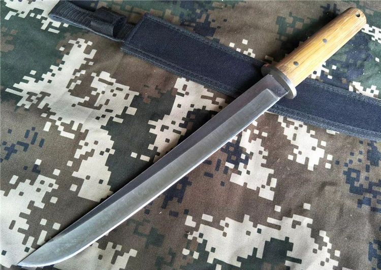 全 长: 42cm 刃 长: 29cm 柄 长:12.7cm 刃 厚: 5mm 刃 材: 不锈钢 硬 度: 58HRC 重 量: 0.85kg 表 面: 氧化黑 柄 材: 坚木 刀 鞘: 尼龙 工 艺: 手工锻炼