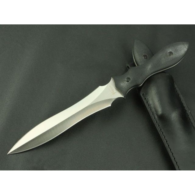 托德·贝格双锋 全 长:288mm 刃 长:150mm 柄 长:120mm 刃 宽:28mm 刃 厚:4.5mm 刃 材:7Cr17Mov 重 量:300g(含包装) 硬 度:57HRC 表 面:砂光 柄 材:黑G10 锁 型:定锁 其 他:配牛皮套和白盒