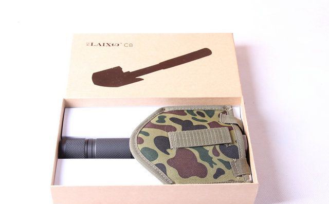 睐斯C8多用工具铲 伸展长度:41.8cm 折叠长度:23.5cm 锹面尺寸:13.2*11.1cm 刀刃长度:9cm 厚度:2.1mm 重量:约750g (含包装物) 刃材:进口不锈钢 柄材:加厚航空铝材 包装:迷彩牛津布袋子,可挂腰上 特点:手柄拉缩型,方便折叠,当手柄拉尽时,再反时针扳转手柄,螺纹已紧.收回时,顺时针返回,再往回拉,完成手柄伸缩程序.