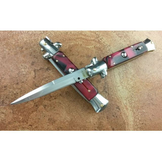 9寸AKC意大利跳刀(玛瑙红柄) 全 长:22.9mm 刃 长:10.2mm 柄 长:325px 刃 宽:30px(最宽处) 刃 厚:3.0mm 刃 材:440 刀 柄:亚力克玛瑙红 开刀方式:弹簧 重 量:150克