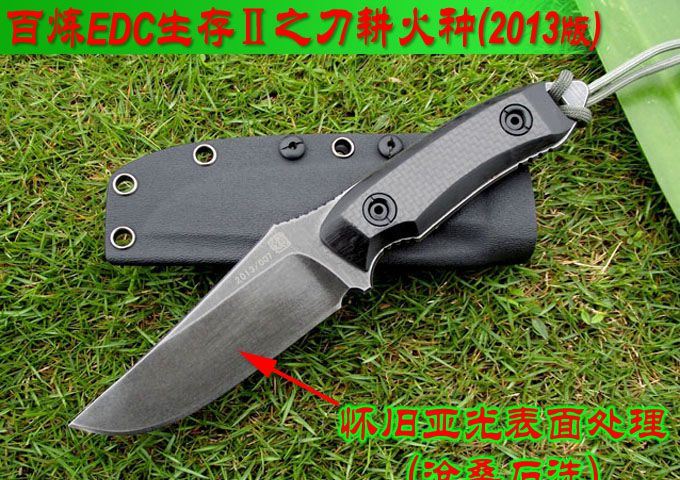 百炼EDC生存Ⅱ之刀耕火种(2013版) 材质:9CR18MOV (锻打) 刃面打磨:高腰V磨 热 处 理:真空+深冷处理 主要性能:切,割,削为主,超凡耐磨性保持性 硬度:60±1HRC 表面处理:怀旧亚光处理 手柄:碳纤维表层G10手柄 尺寸: 全长: 220MM; 刃长: 105MM; 刃厚: 4.5MM. 配件:加厚K鞘、携带系统
