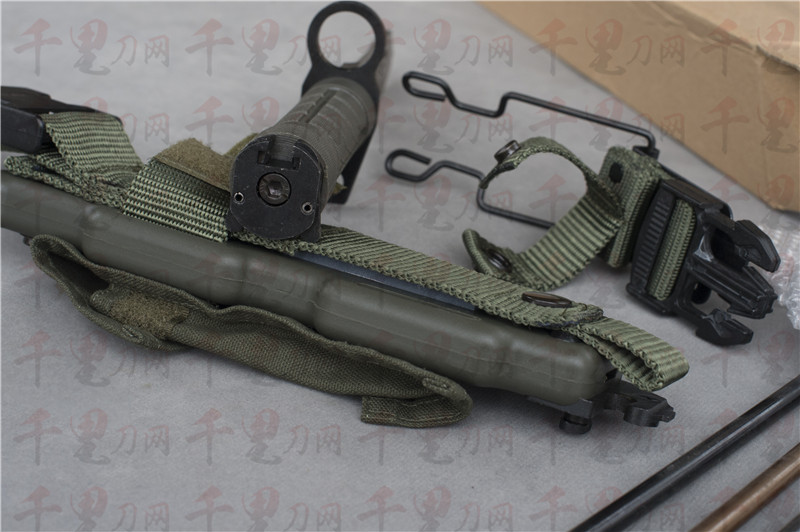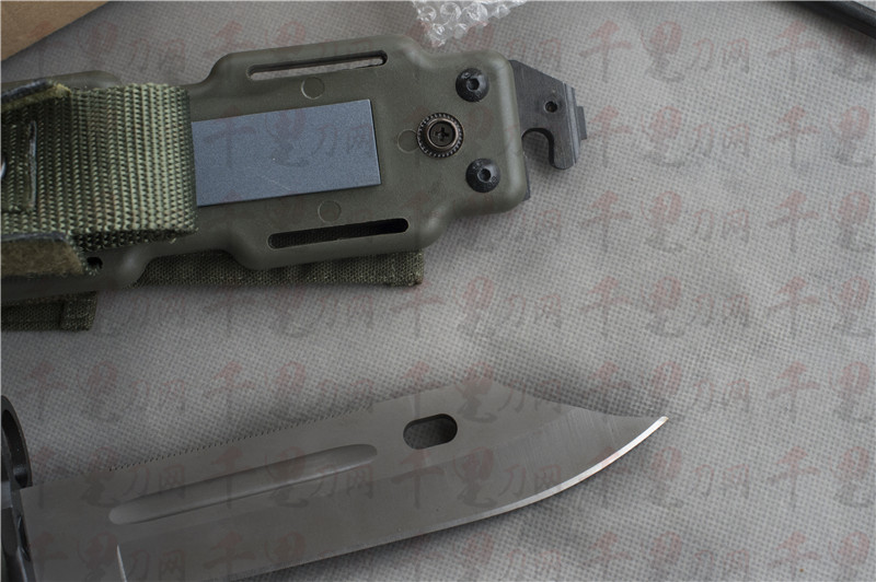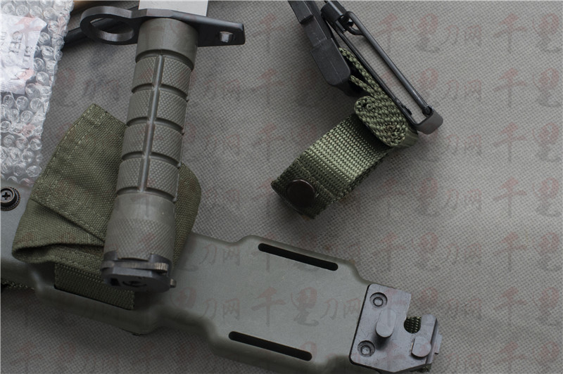 刀鞘:ST801尼龙 ,内置Stainless Steel刀身,固定安全装置,背面隐藏镀铝陶瓷磨刀棒,MOLLE多功能挂具,排水功能孔,低噪音设计