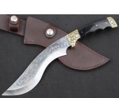 小月牙狗腿(黑檀木柄) 全 长:295mm 刃 长:188mm 柄 长:113mm 刃 宽:40mm 刃 厚:4.0mm 刃 材:5Cr13Mov 重 量:399g(含包装) 硬 度:57HRC 表 面:腐蚀纹 柄 材:双铜头+黑檀木柄 锁 型:定锁 其 他:配牛皮套