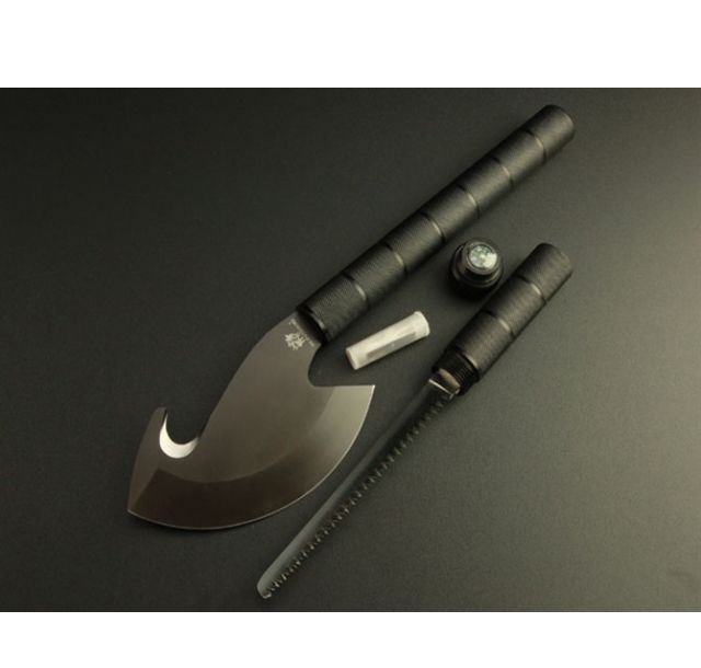 全 长: 51cm 刃 长: 16.5cm 柄 长: 36cm 刃 材: 440 不锈钢 硬 度: 56 HRC 表 面: 氧化黑 刃 厚: 4.5cm 净 重: 710g(含包装) 其 他:全刃开锋,附尼龙套