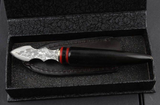 水牛角樱枪大马士革刀 全 长:152mm 刃 长:55mm 柄 长:97mm 刃 宽:17mm 刃 厚:2.1mm 刃 材:大马士革 重 量:127g(含包装) 硬 度:58HRC 表 面:钢本色 柄 材:铜头+水牛角 锁 型:定锁 其 他:配牛皮套+硬纸盒
