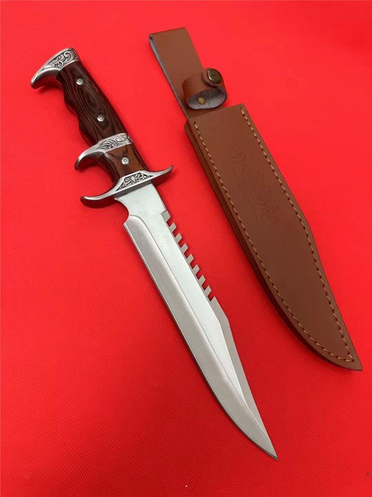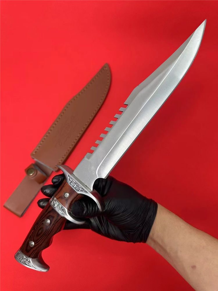 刀奴系列战斗刀 (小号) 全长:38cm 刃长:24cm 刃厚:0.80 刃材: 440高级不锈钢 硬度: 57HRC 表面:镜光 重量:1454g(含包装) 刀柄:钢头+红木 刀鞘:牛皮+纸盒