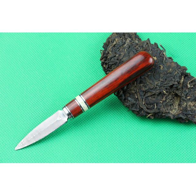 大马士革钢普洱茶扁头撬茶刀 全 长: 14.5cm 刃 长: 5.1cm 刃 宽: 1.5cm(最宽处) 柄 长: 9.2cm 硬 度: 59HRC 刃 厚: 0.8cm 重 量:110 克(含包装) 表 面: 纯手工制造 刃 材: 大马士革 柄 材: 钢头+兽骨+天然黄檀木 其 他: 配真皮套,大马士革钢花纹和把手木纹及颜色各异,以实物为准 .