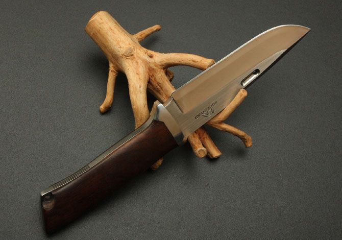 花田洋直刀 材质: YXR-7 HPC 全长: 25cm 刃长: 12.5CM 刃厚: 0.6 CM 刃宽: 3.8 CM 血槽: 无血槽 表面: 镀膜处理 硬度: 60 HRC 柄材: 高档奢华铁木木柄 工艺: 手工与数控精密 刀重: 300g 产地: 中国OEM