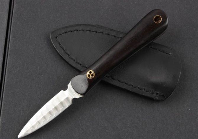 黑檀花梨-大马士革茶刀 全 长:144mm 刃 长:55mm 柄 长:90mm 刃 宽:13mm 刃 厚:2mm 刃 材:大马士革 重 量:68g(含包装) 硬 度:58HRC 表 面:钢本色 柄 材:黑檀木 锁 型:定锁 其 他:配牛皮套
