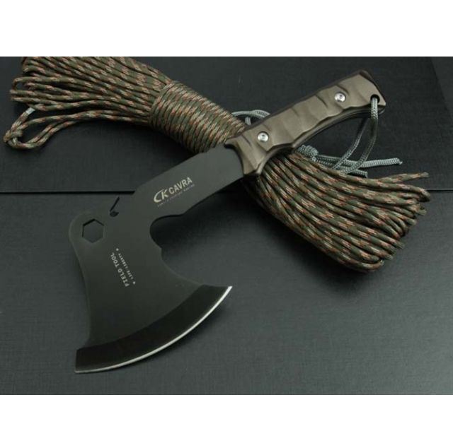 F08斧头(黑色、灰色) 全 长:275mm 刃 长:110mm 柄 长:120mm 刃 宽:102mm 刃 厚:5mm 刃 材:3Cr13Mov 重 量:520g(含包装) 硬 度:55HRC 表 面:氧化黑和灰色 柄 材:铝柄 锁 型:定锁 其 他:配尼龙套和白盒
