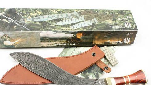 09限量版波纹钢米克狗腿 全长:42cm 刃长:28cm 刃宽:5.7cm (最宽处) 刃厚:0.6cm 刃材:新型波纹钢,手工锻打,档次相当于大马士革钢,不刮花,不变色。 硬度:58HRC 表面:不规则波纹,表面处理方法属于商业秘密 柄材:名贵酸枝木+红影木+纯铜 柄长:12.3cm 刀重:800克 总重:1100克(含包装物) 品质:高品质,刃口非常锋利 其他: 刀身贯穿至刀柄末端,用铜钉固定